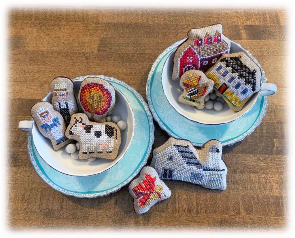 So that’s my hobby sewing– here’s the business sewing for the week! I’m making good on my promise of FREE tiny village houses– the link to download the red barn is below. (It’s a direct link, just to thank my blog readers!) This is the upgrade kit which includes more buildings, the farmers, and turkey and cow friends. I’ve moved beyond bowls– they look super cute in my teacups!