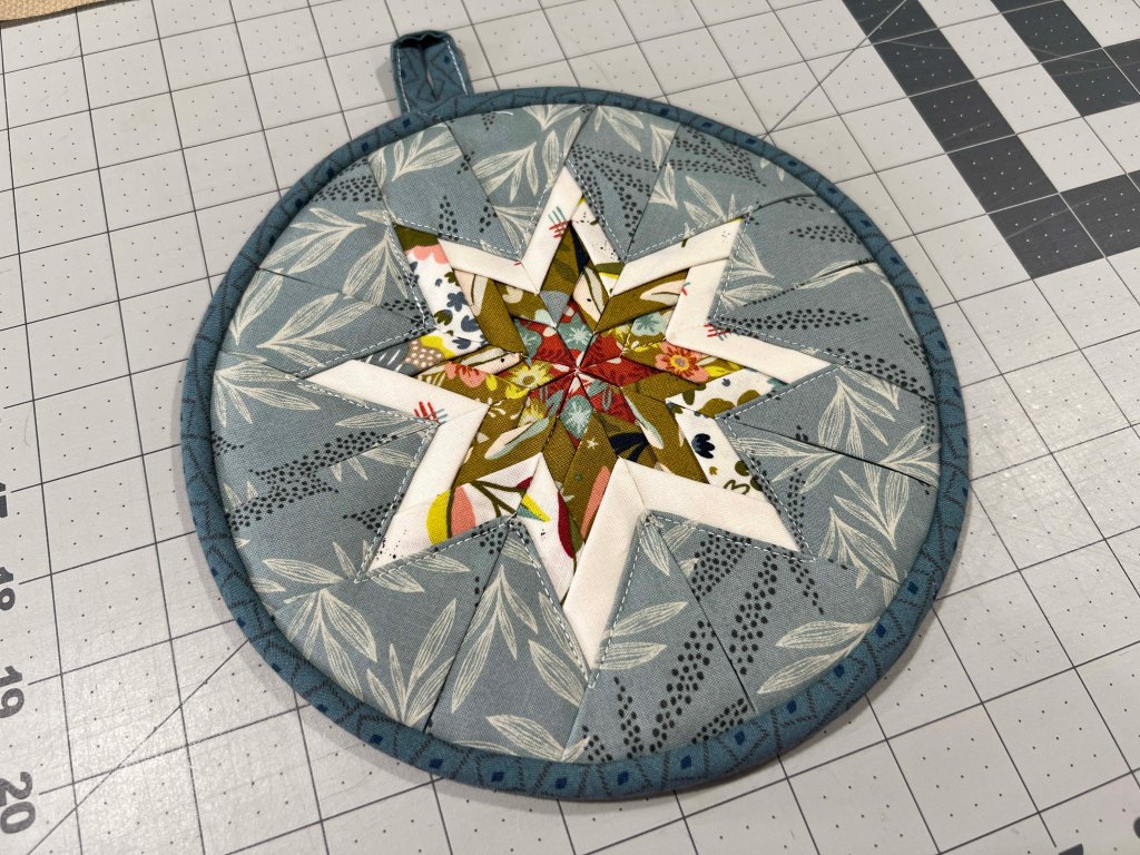I thought these hot pads were going to use up my scraps– they do not. You need a significant amount of the same fabric for all of that folding. And it’s not a sewing project, it’s more of a folding and ironing job, so be forewarned. They are a pretty though, so much so that you could hang it in your kitchen and not use it as a hot pad at all.