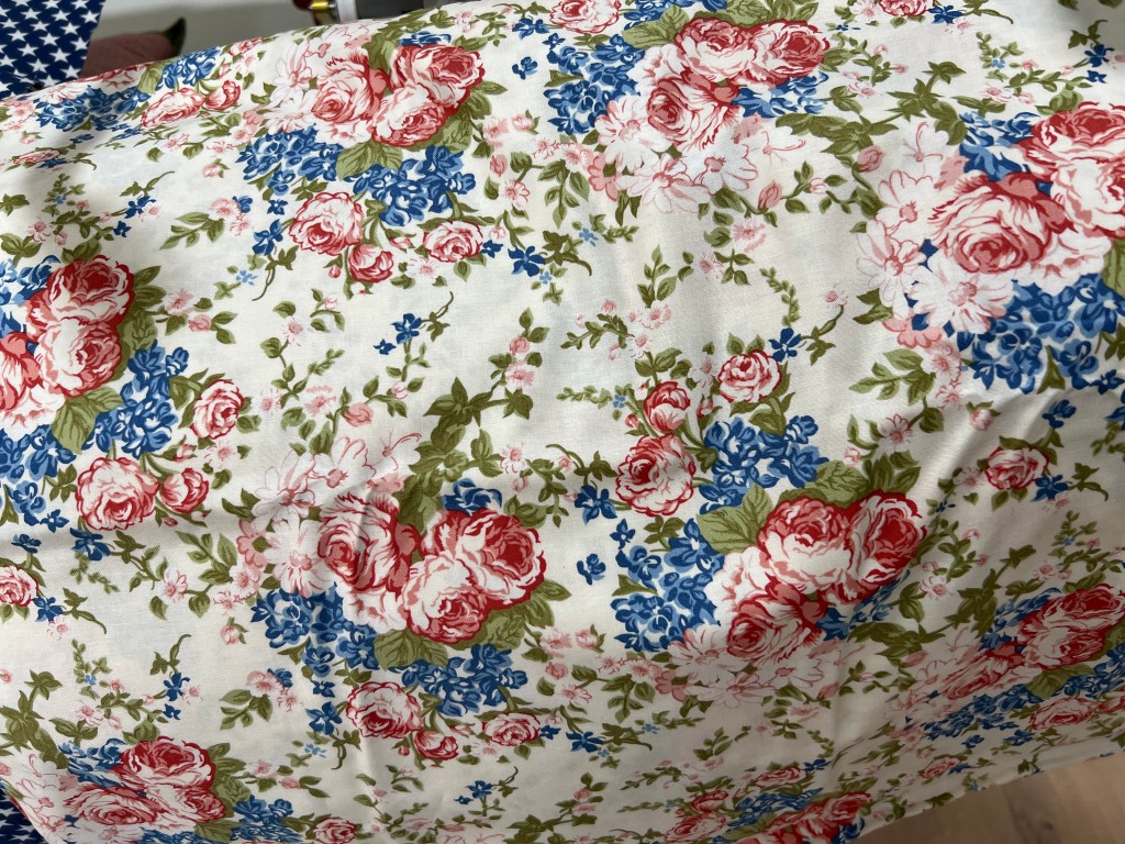 I also pieced the backing– I’m using this beautiful floral print on the back so if his girlfriend doesn’t appreciate chickens, she can just flip it over. I had six yards of it– it’s from my all time favorite collection, “Mackinac” by Minick and Simpson. It was meant for a different project, but I had a talk with myself about using what I have and also how these treasured fabrics aren’t creating much joy on a shelf, are they?