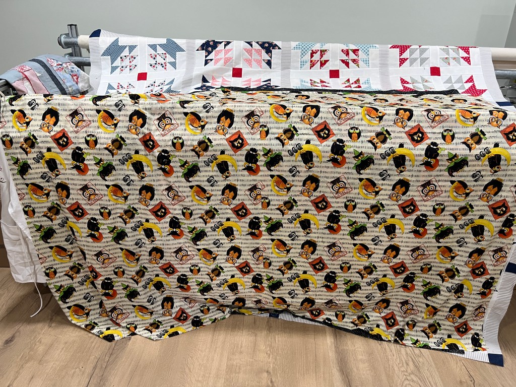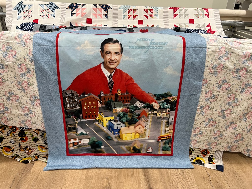 Then, Mr. Rogers has a couple nice borders on and is ready for quilting. This explains why I don’t sew with panels– all you do is add borders which is my least favorite part of quilting!