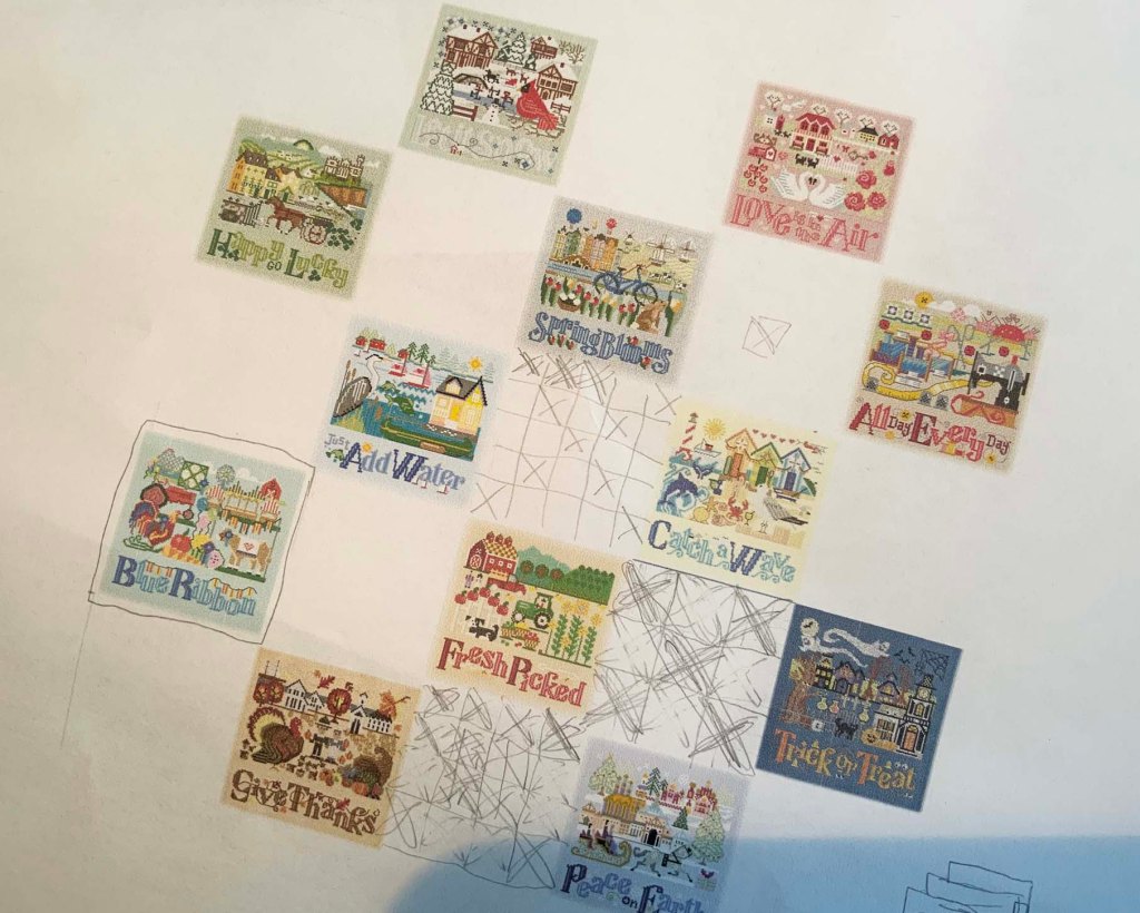 It’s time to make this series into some type of glorious wall hanging– just let me get through the Christmas rush first, though! I want to make blocks with X’s in them– it’s a common block type, but oh, so appropriate for cross stitch. This is my first sketch– I do like to work in Photoshop, but someday I wish I would just take advantage of EQ8 which I have and which I actually took a class for.