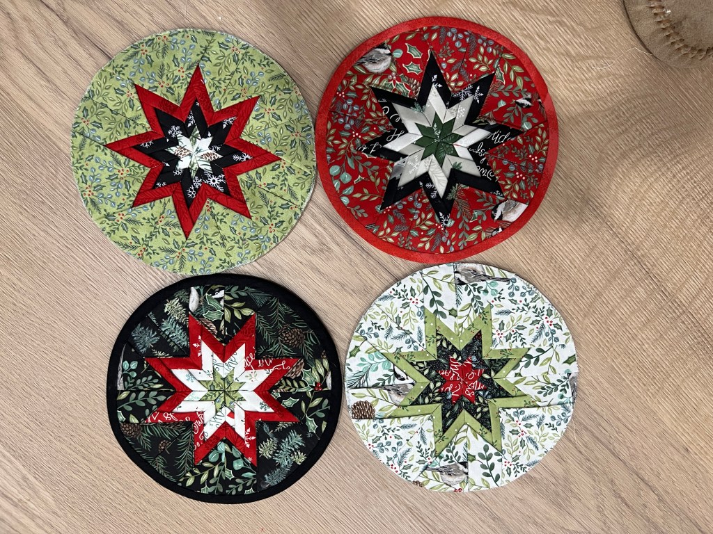 Finally, here’s my folded star hot pad production line! They’re still taking too much time. I made a total of five so far. Loving this Deb Strain fabric from last year. These are all spoken for– then I’d love to make a set of three for myself, but my attention is starting to wander.