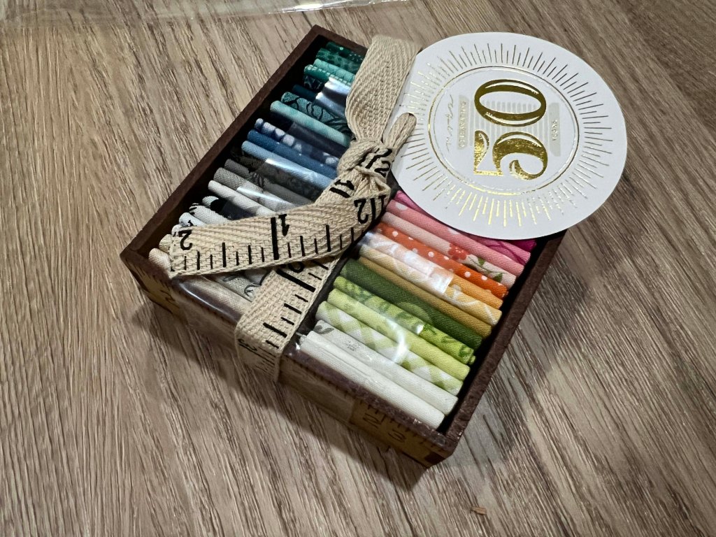 This thing has been on my wish list to be notified of and here it is. A super cute– TINY box of fabrics from a 50th anniversary Moda collection.