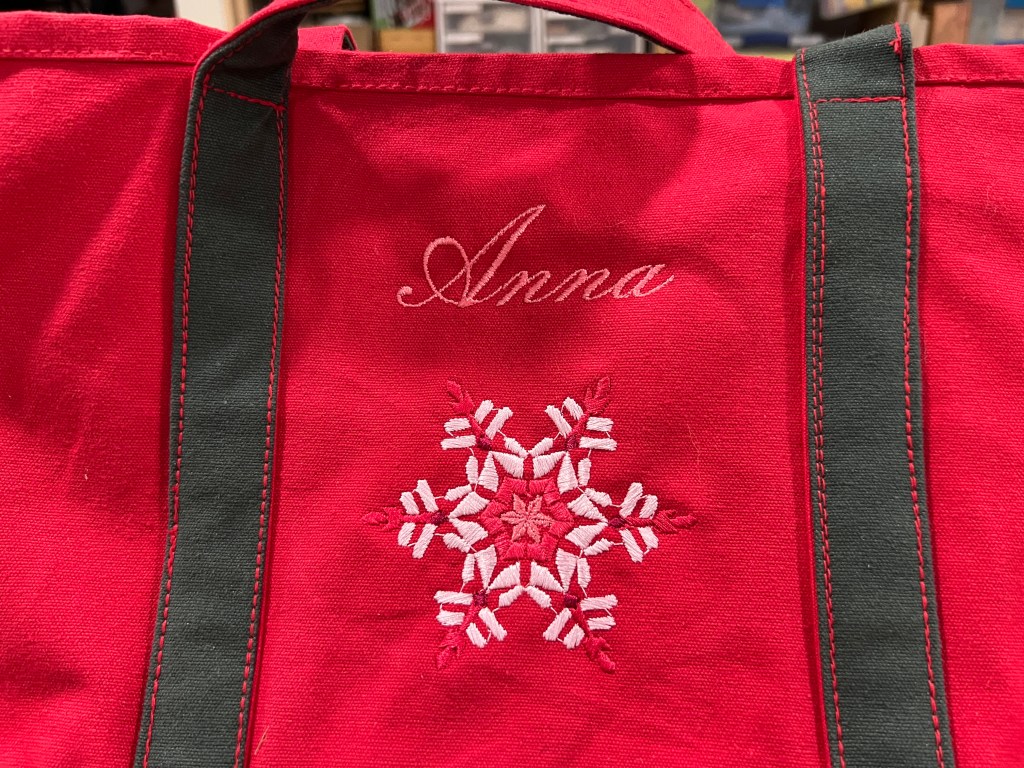 Smaller Christmas gifts are in the works, but are coming along slowly! I got some bags at our wonderful local department story, “Reny’s,” for just $9.99. When you have an embroidery machine, its so easy to turn raw materials into fabulous personalized gifts!