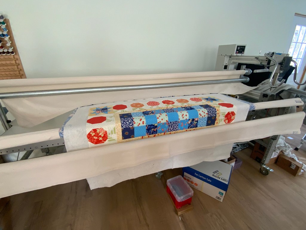 All I had left to do was add on some 100” borders– not my favorite job, and it’s been draped over the longarm for quite a few weeks. I discovered that the longarm is a great place to pin up long borders. You can guess how much longarming has gotten done in those weeks. I now have my Fruit Cocktail Table Runner (Fig Tree Fabrics) uncovered which has been queued up since mid-October. One of my goals this January was to get moving on quilting again!