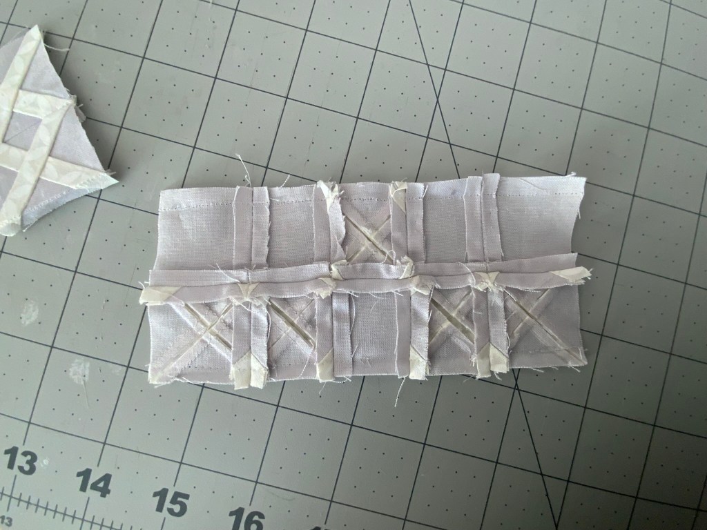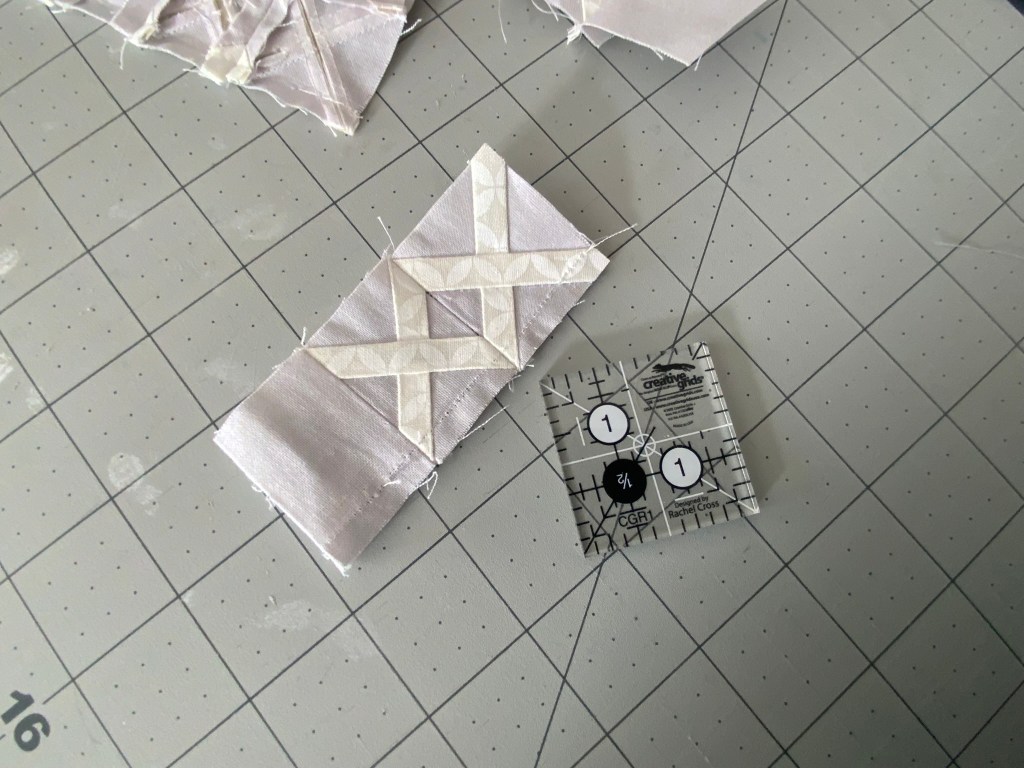 Third, even though I have the handy dandy little trimmer, I’m having trouble getting the finished rows to measure 5-1/2″. I will give myself an A+ for getting the white strips to align from block to block, though! I’m sure once I flip all the crosses the same way, that skill will evaporate.