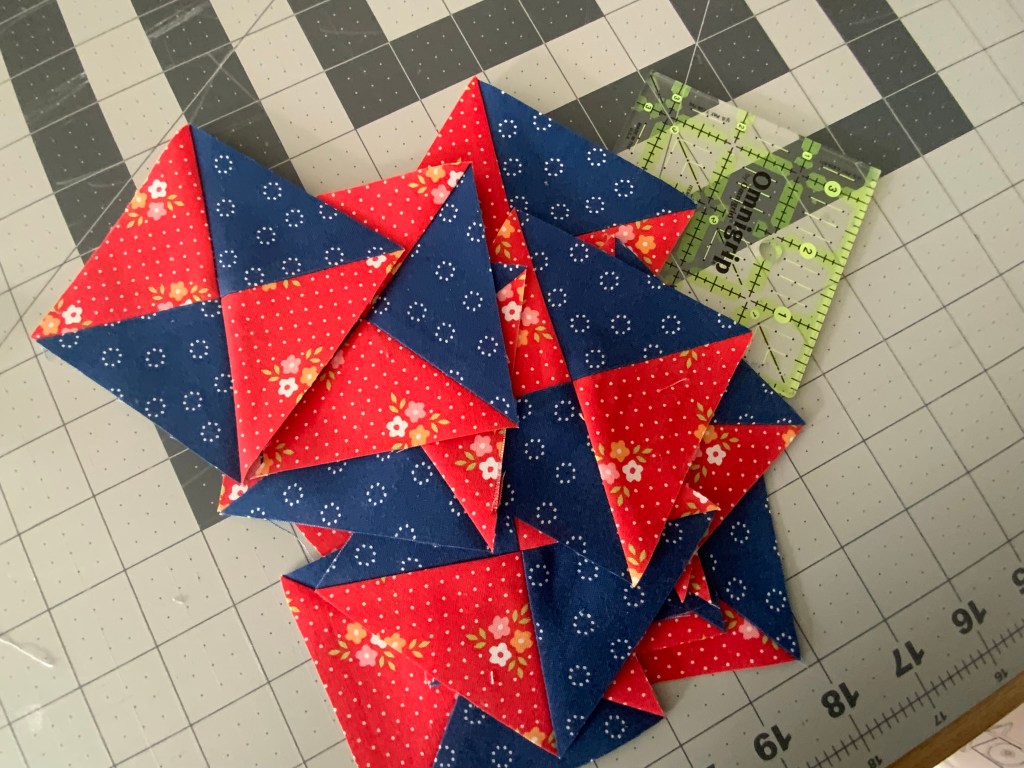 I made 15 hourglass blocks which gives me a head start this week on four “Piece and Plenty” blocks. These blocks have a lot of pieces, but they are big at least!