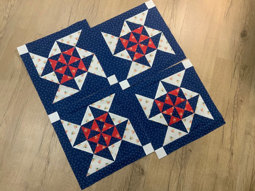 Back on the home front, I finished four “Piece and Plenty” blocks. True to their name, they had plenty of pieces. I thought I was done before realizing they needed the frame put on them.
