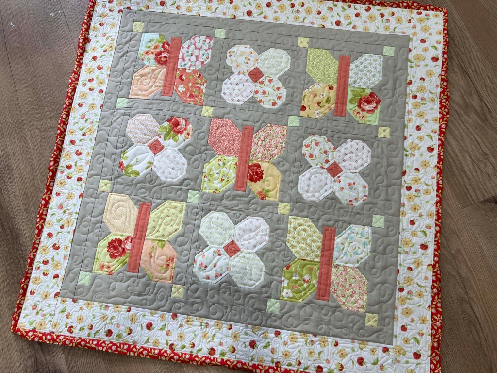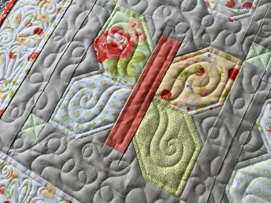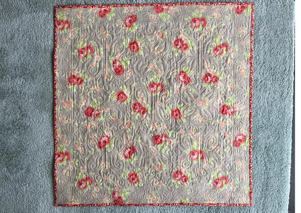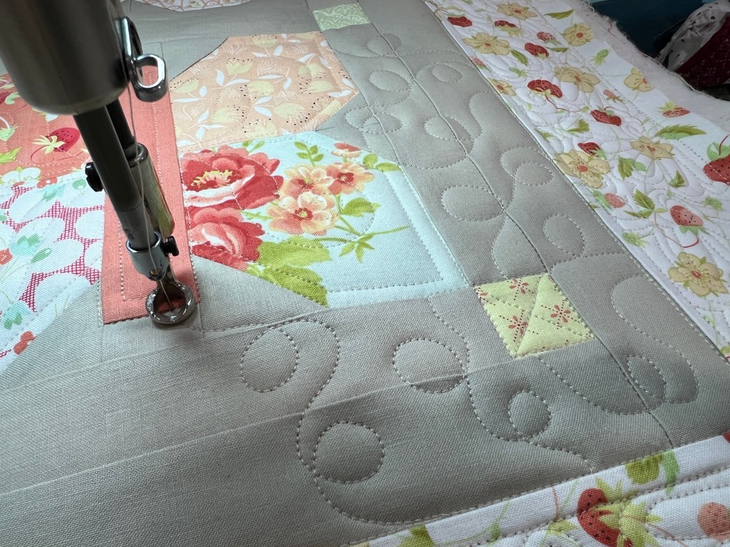 I did daisies in the border, little loops in the sashing (this is me imagining how a butterfly flies 🙂 and then some simple outlining in the blocks with limited swirls. It was fun and quick to do– I still find quilting very intimidating– but, we got this people!
