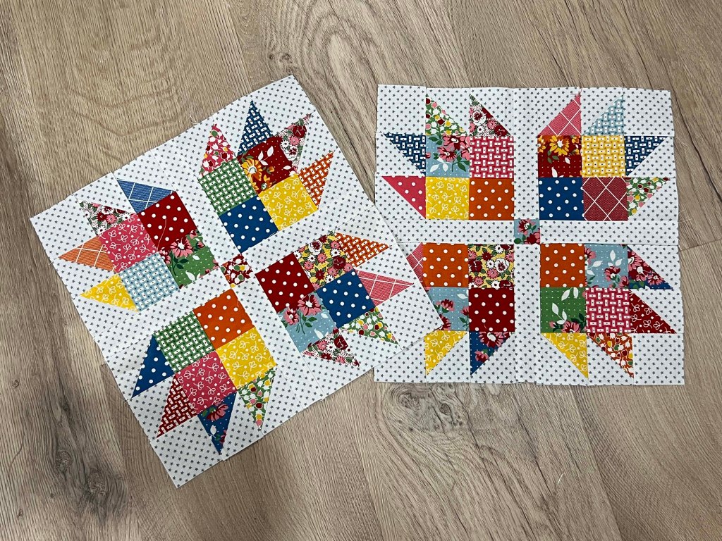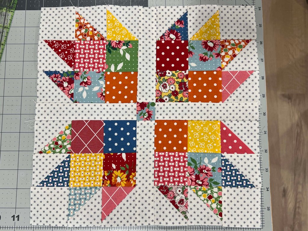 The piecing of the blocks is going well– they are the perfect placemat size– 12″ x 12.” The colors are the perfect, happy summer colors for my picnic table… but wait!
