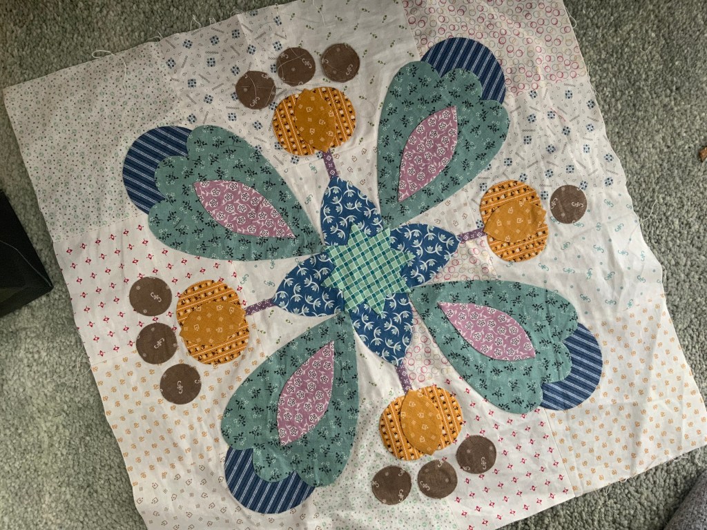 In the spirit of finishing up, I have three hand stitch things that just need a feather to push them across the finish line! I’m going to work on them this week– what’s left of it anyway. Here is my LAST block of twelve for the Prairie Meadow quilt– all hand stitched! As you can see– two little pennies are left to wrap it up.