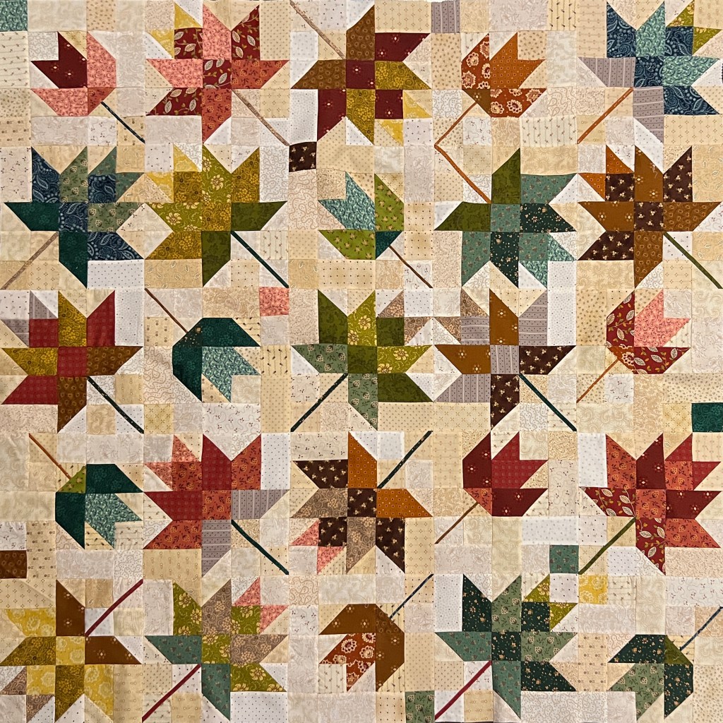 Then I have my larger leaf quilt– an original design made as part of my Sew the Samplers Challenge in 2024. (What a relief something is only a year old.) It still needs one more round of bricks, and of course, to be quilted. I can do that in three nights now, right?