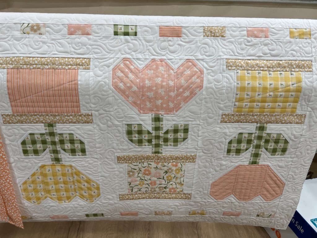 I intend to bind this right away– binding strips are already sewed together. I am way ahead of my May baby shower deadline on that… boom!