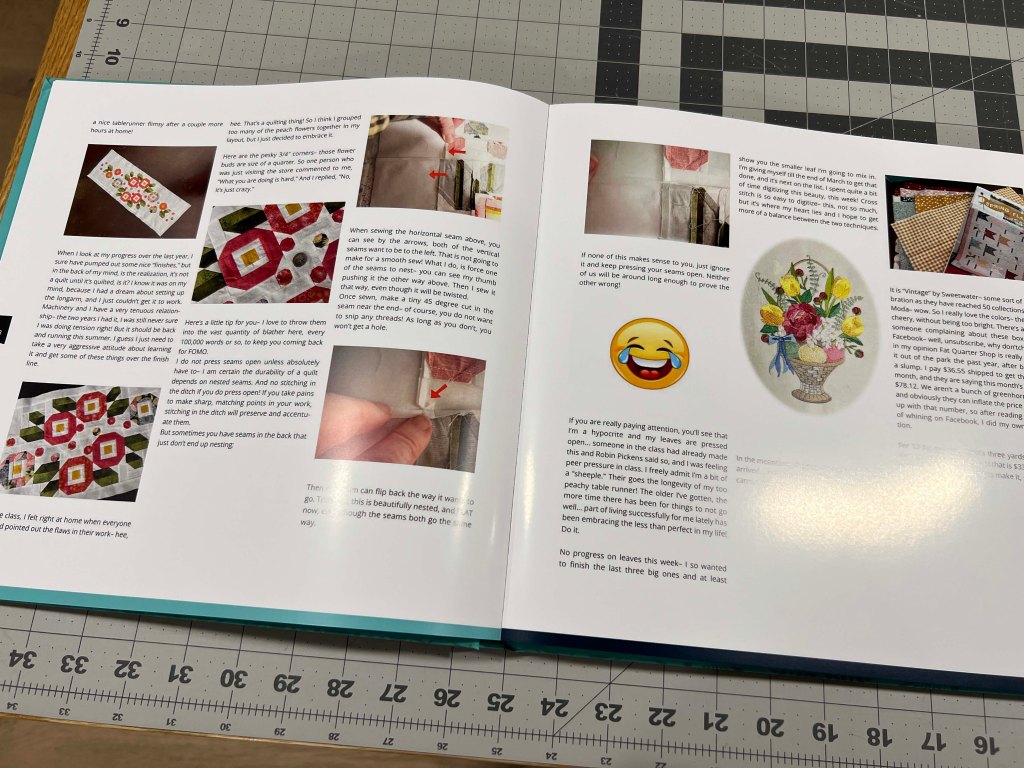 I imported my blog, and to avoid going into two or three volumes, (heehee, blab much?), I had to get the biggest 12×12 size. I picked a three column format, so all the pictures and text are nicely lined up on each page, automatically. The “chapters” are each month and had those big divider pages, and each post heading stands out in large blue text.