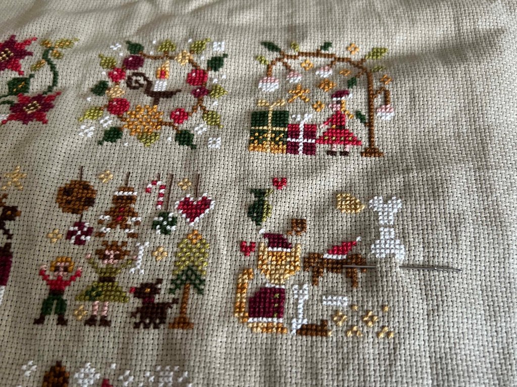 You can see the Appalling Cross Stitch is rapidly coming to a conclusion. I finished the girl and gifts and pet ornaments are almost done. Only two left to finish the column. I had to order some extra green and brown floss which I’m still waiting for. I used Classic Colorworks thread– it is beautiful, but honestly I think I’d call myself a DMC girl, not only for the pricing, but for the ease of buying it locally, even up here.