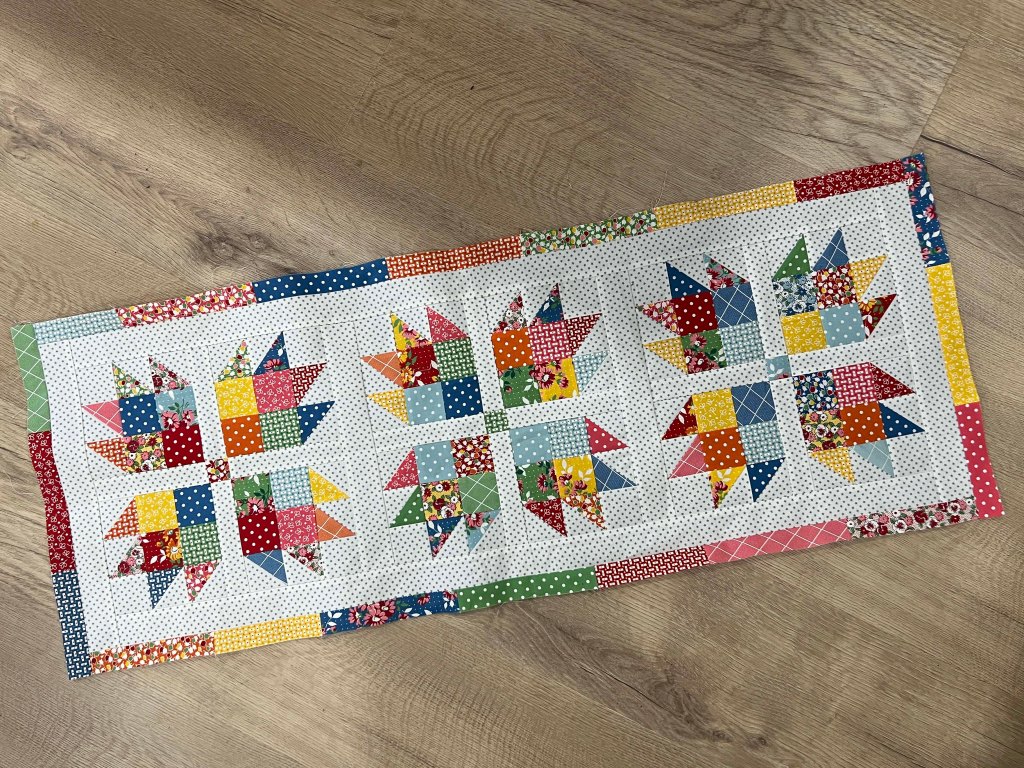 And the table runner just needs one more round of borders. It is BIG! NONE of this is really going to fit on my picnic table, I now realize. I really have no concept of size in my head. But if it rains for summer BBQs, it might all just fit on my dining room table, fully extended.