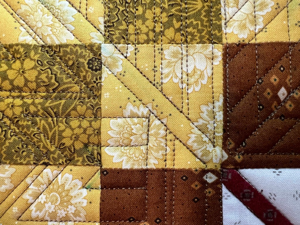It’s hard to see the quilting, but don’t worry. The dark thread on the yellow backing fabric I picked promises to show every mistake! This is my first show quilt since 2020 and the first one that doesn’t use machine embroidery quilting. I have a lot to learn in terms of making thread and fabric choices, obviously. I picked this yellow back because I loved it and that’s not a great motive in the show world.