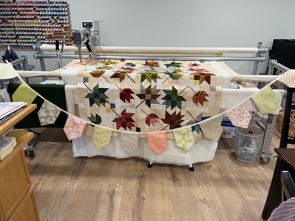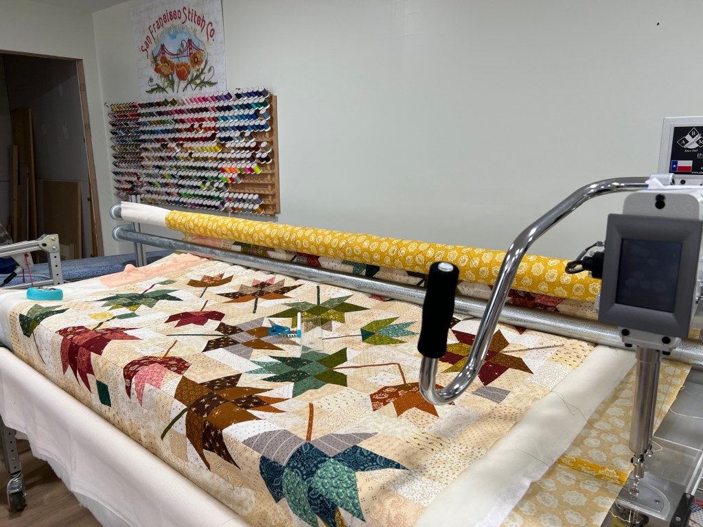 Meanwhile, in the studio, it’s fall– I am obsessed with the longarm lately. I’m working through 25 autumn leaves with straight line, geometric quilting. The background will be windy swirls, of course. That straight line, swirl combination is a combination everyone loves.
