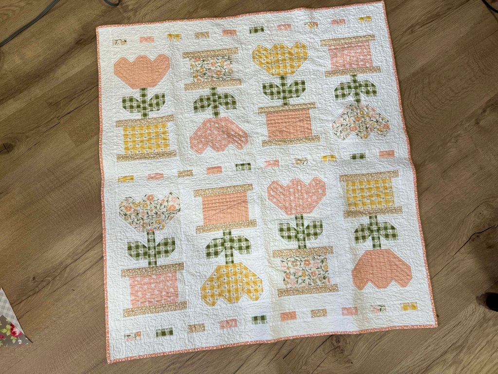 Of course, the Bobbins and Blooms quilt is ready to be gifted! I pre-washed it– a baby quilt has to be washable right? It went all crinkly on me. My wonderful rose and leaf quilting is completely lost. But at least it’s not like a piece of cardboard anymore. Yup, I’m a starcher. Some people love the crinkly look– do you wash your quilts?