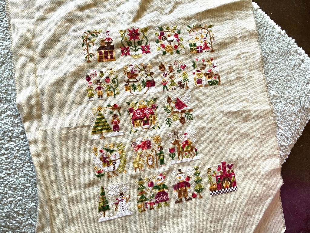 And last topic– my nightly hand stitching. You won’t be further appalled by the appalling cross stitch until the fall now. I’m putting it away. I’m short the two last blocks– and I won’t lie– I’m making it a longer project by adding in a little line or decoration between the blocks. The quilter in me needs sashing, I guess, even on a cross stitch project. Maybe it will have time to flatten out a bit!