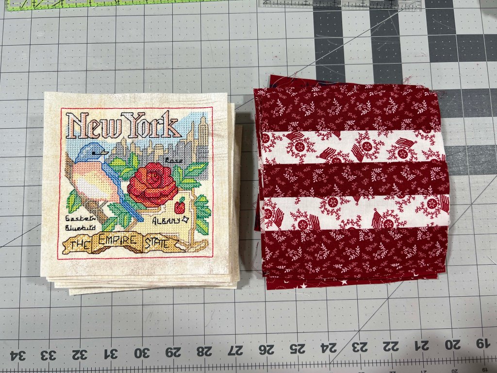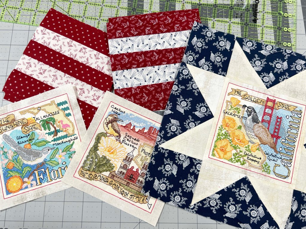 I spent some quality time last week trimming up my state blocks and getting most of the 49 required stripe blocks made– a cinch! The Fat Quarter Shop has a 5-1/2″ creative grids ruler that made trimming a breeze.
