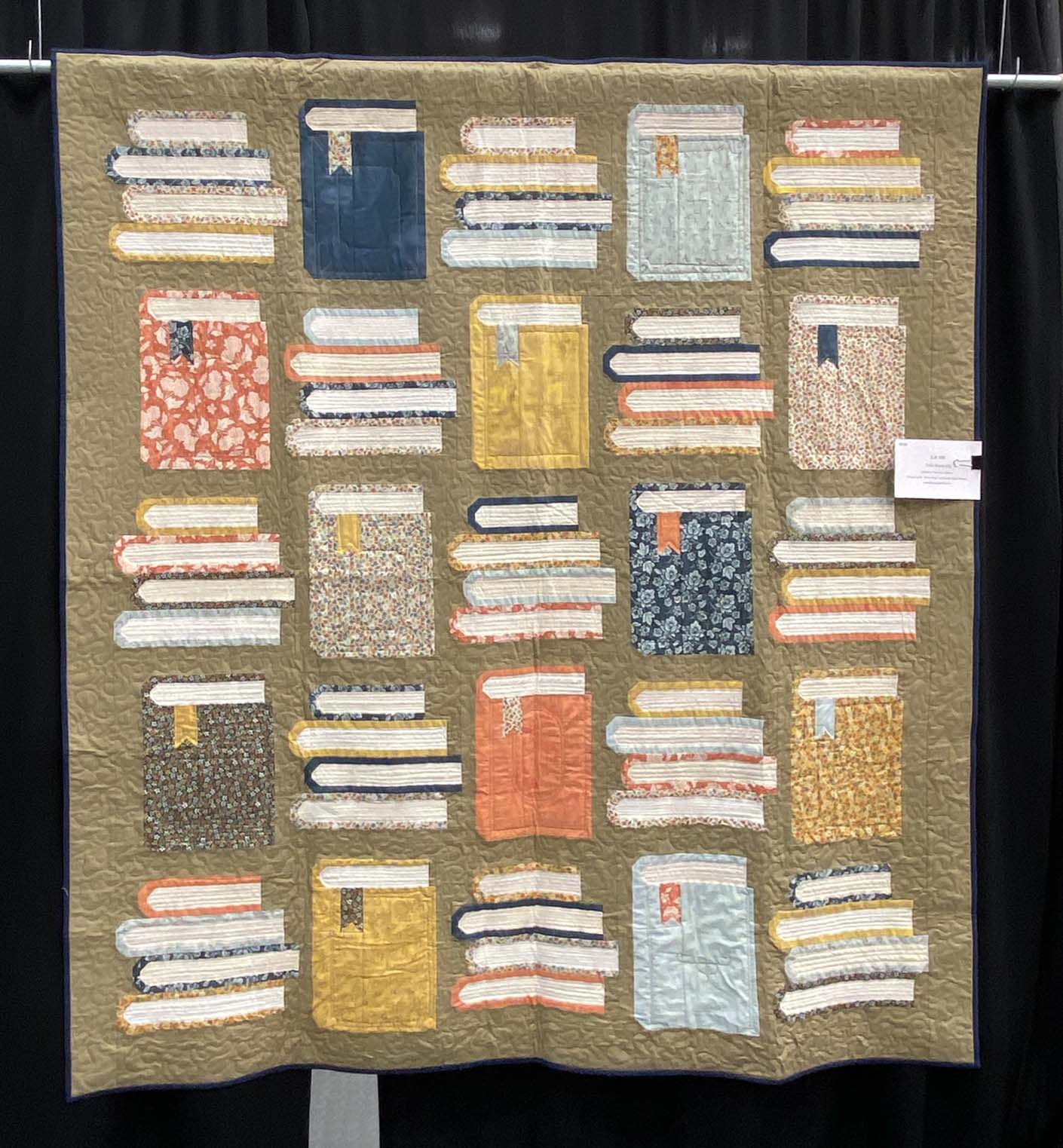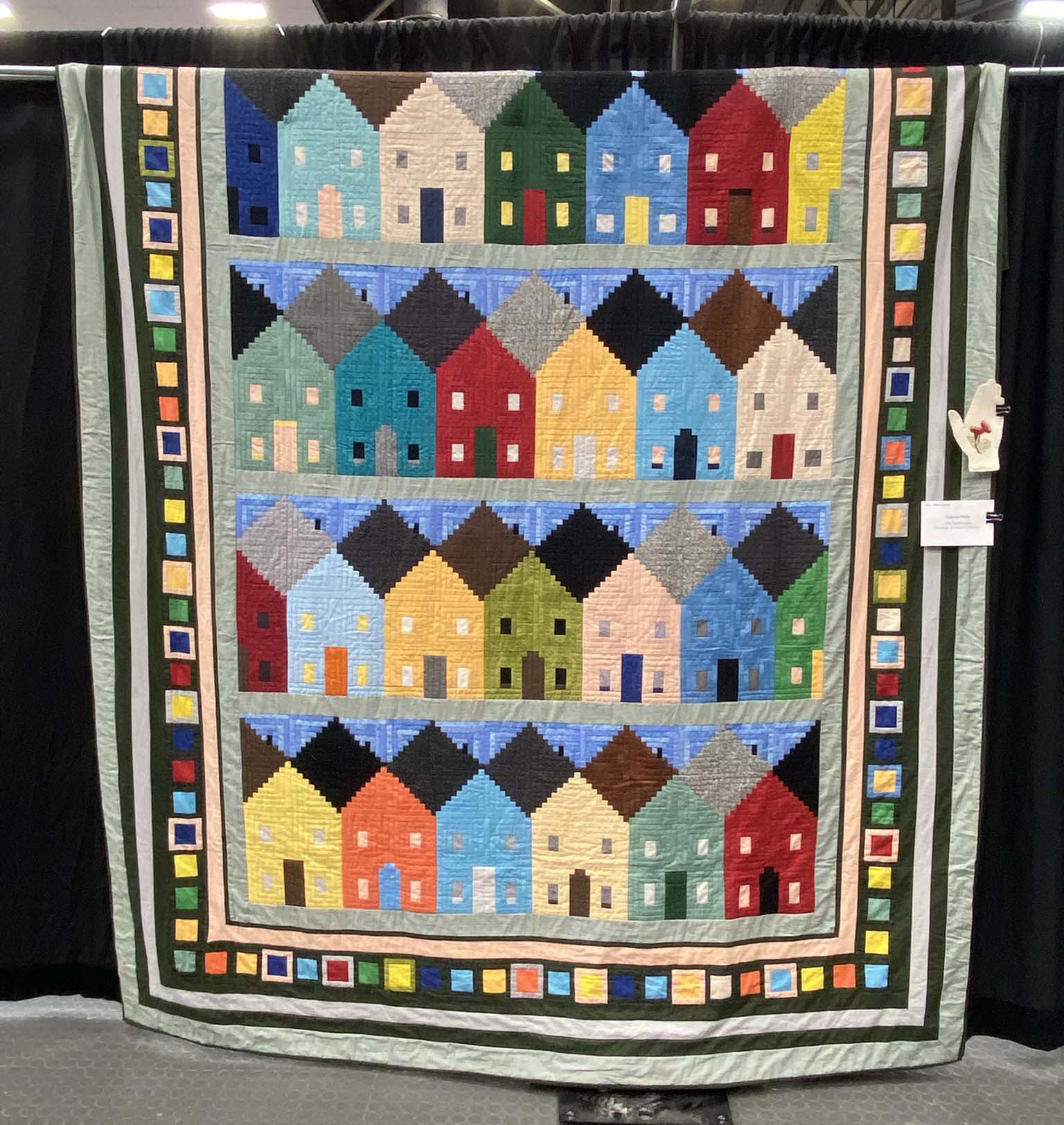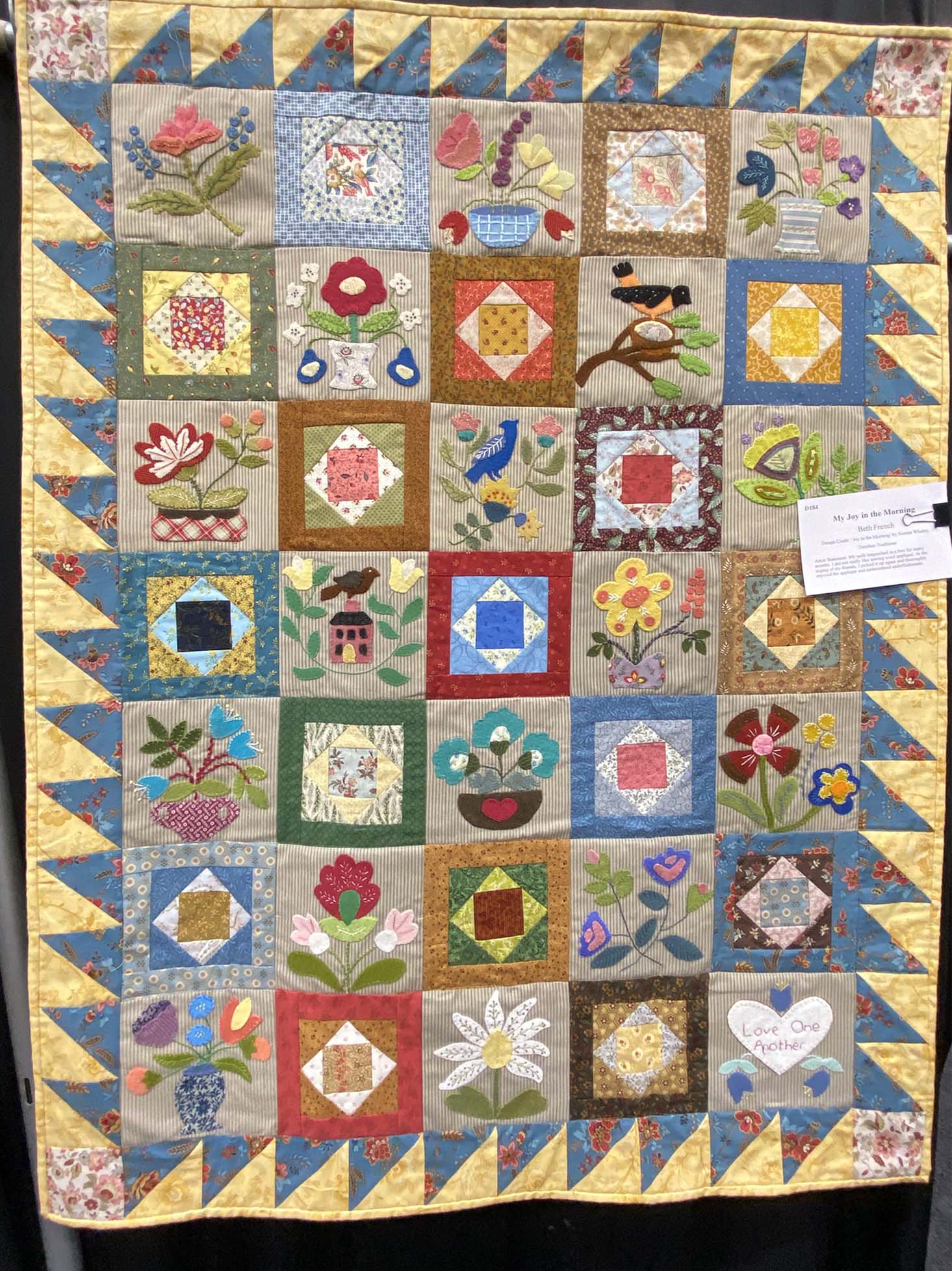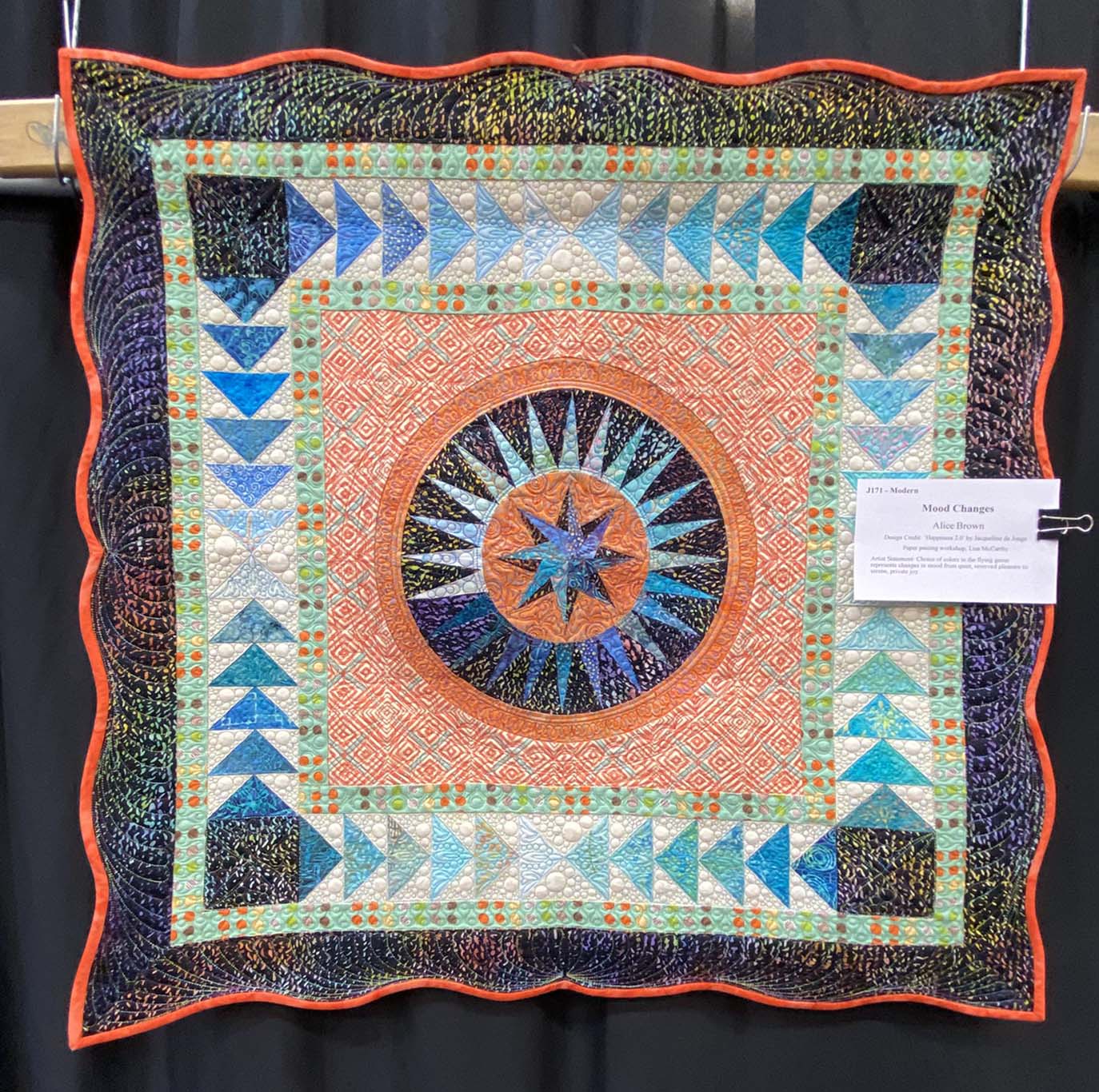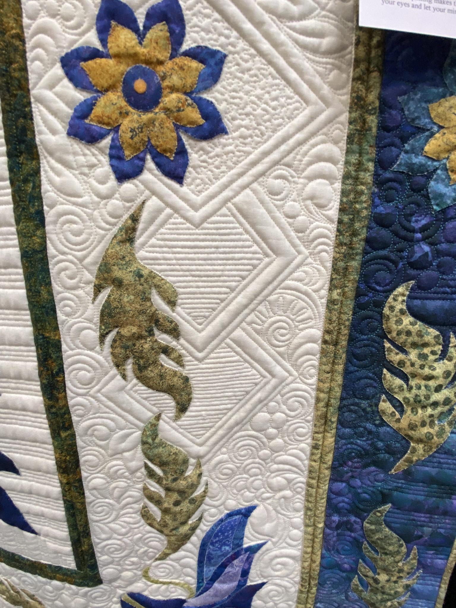 There won’t be a blue ribbon for my show photography and for that I apologize. It was busy, and I had to take the photos at an angle to avoid having people in front of them, then “unskew” the photos in Photoshop. So, usually I can read the name tags on my photos– not so much this time as the unskewing really skewed up the words. I did my best with show book in hand– a few names I just can’t figure out, but I don’t want to delete the quilts. I still may be able to find some on the web–if you recognize one, let me know! Some good news– if you click on the photos, you can see them enlarged.
