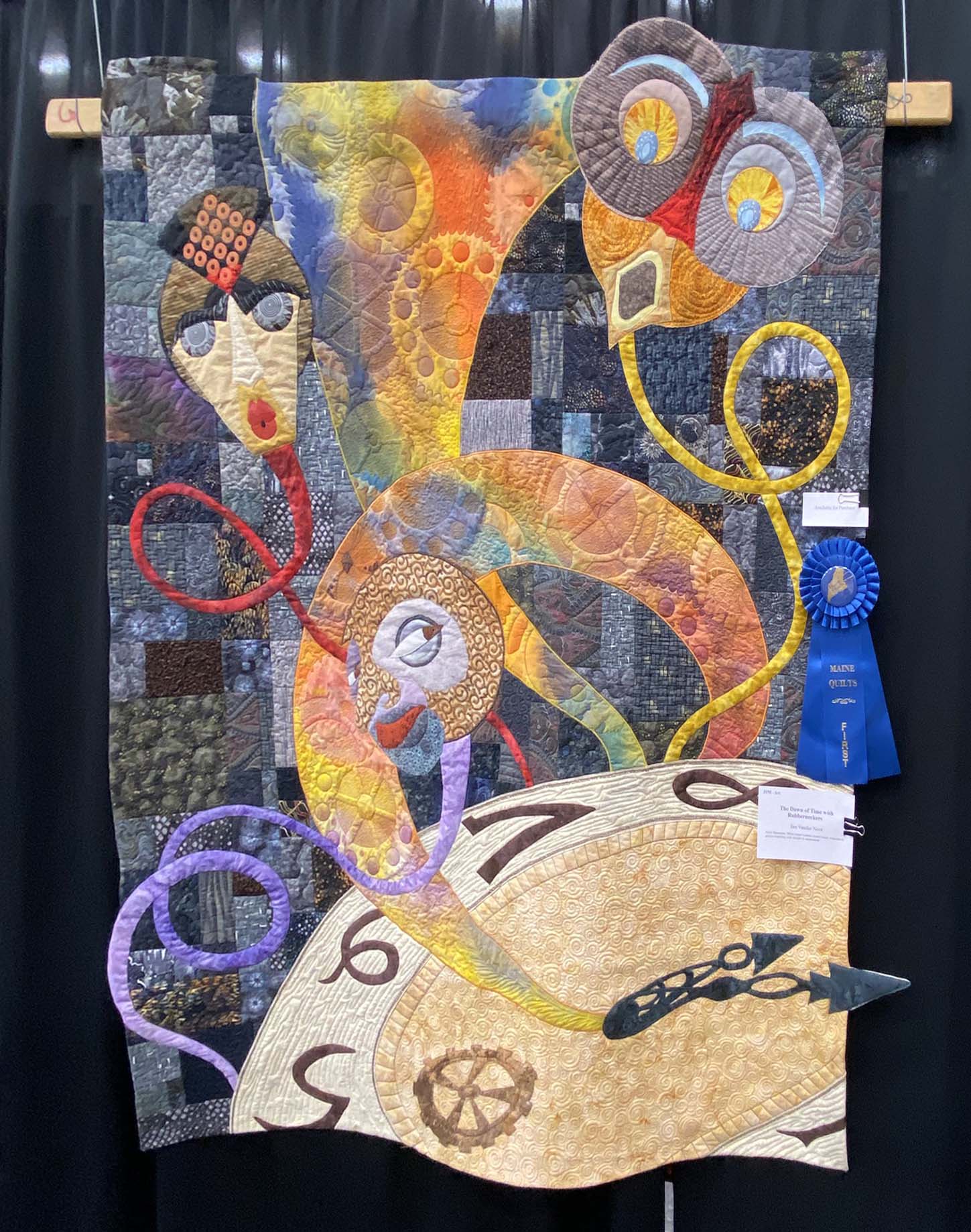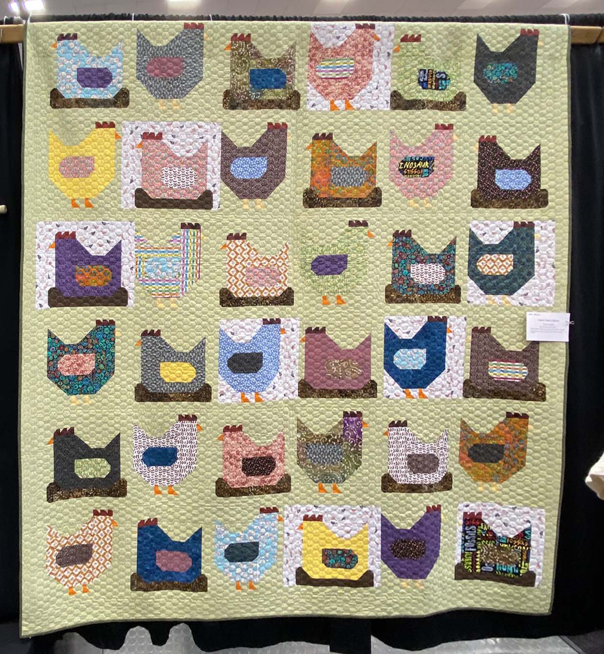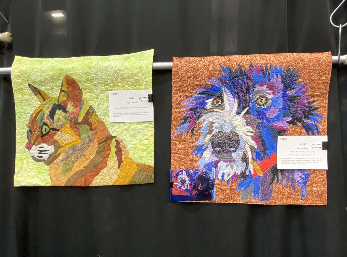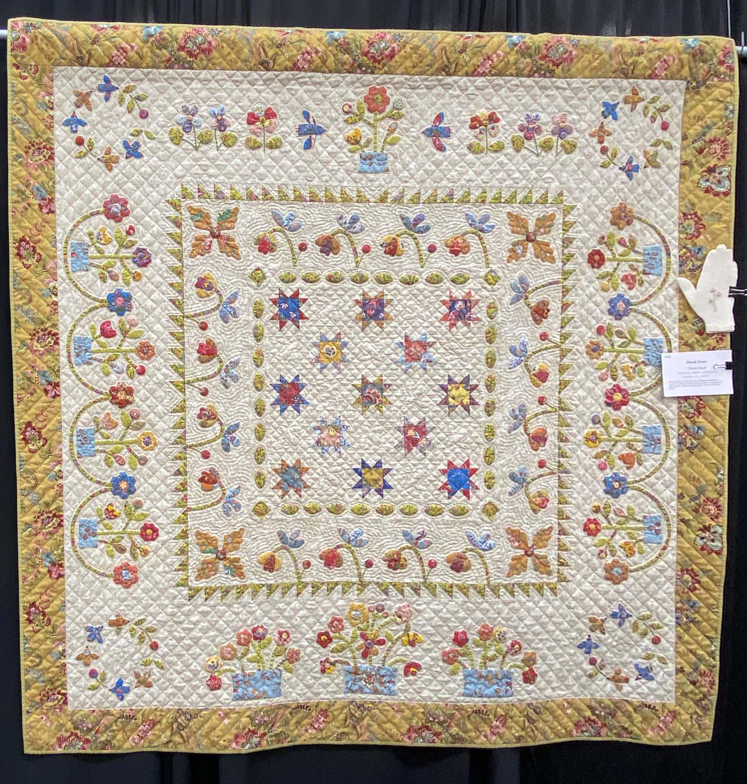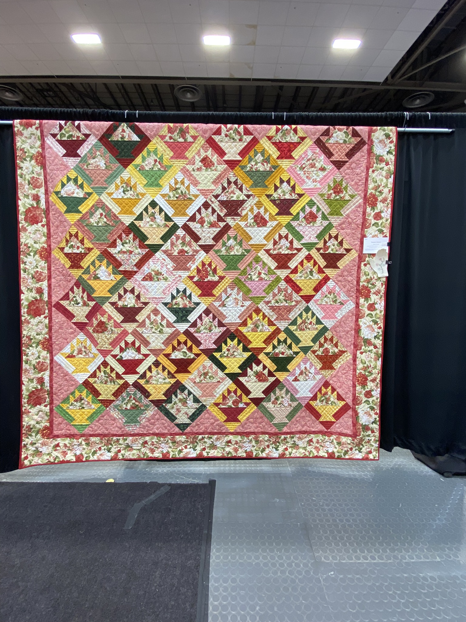 There won’t be a blue ribbon for my show photography and for that I apologize. It was busy, and I had to take the photos at an angle to avoid having people in front of them, then “unskew” the photos in Photoshop. So, usually I can read the name tags on my photos– not so much this time as the unskewing really skewed up the words. I did my best with show book in hand– a few names I just can’t figure out, but I don’t want to delete the quilts. I still may be able to find some on the web–if you recognize one, let me know! Some good news– if you click on the photos, you can see them enlarged.