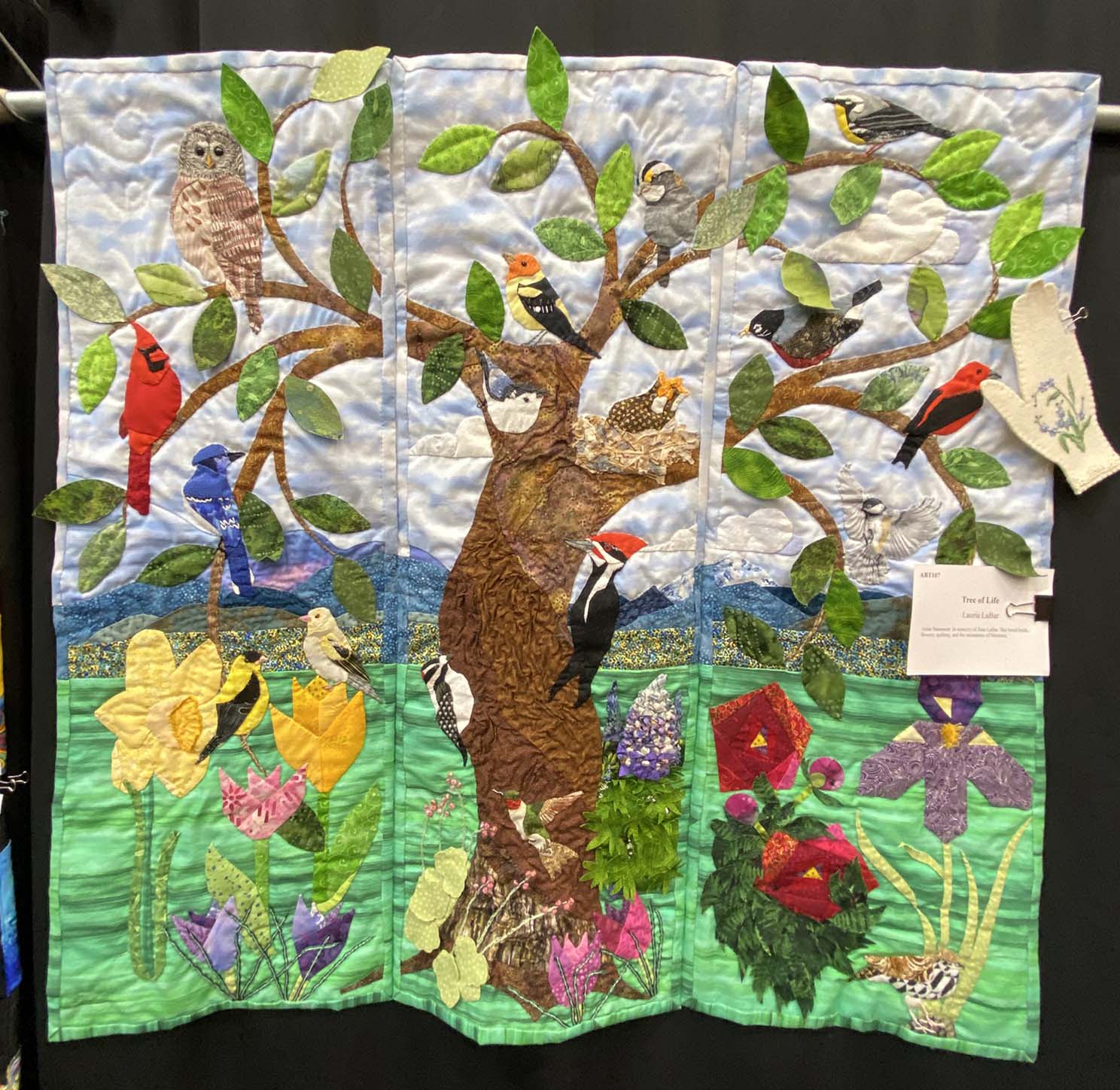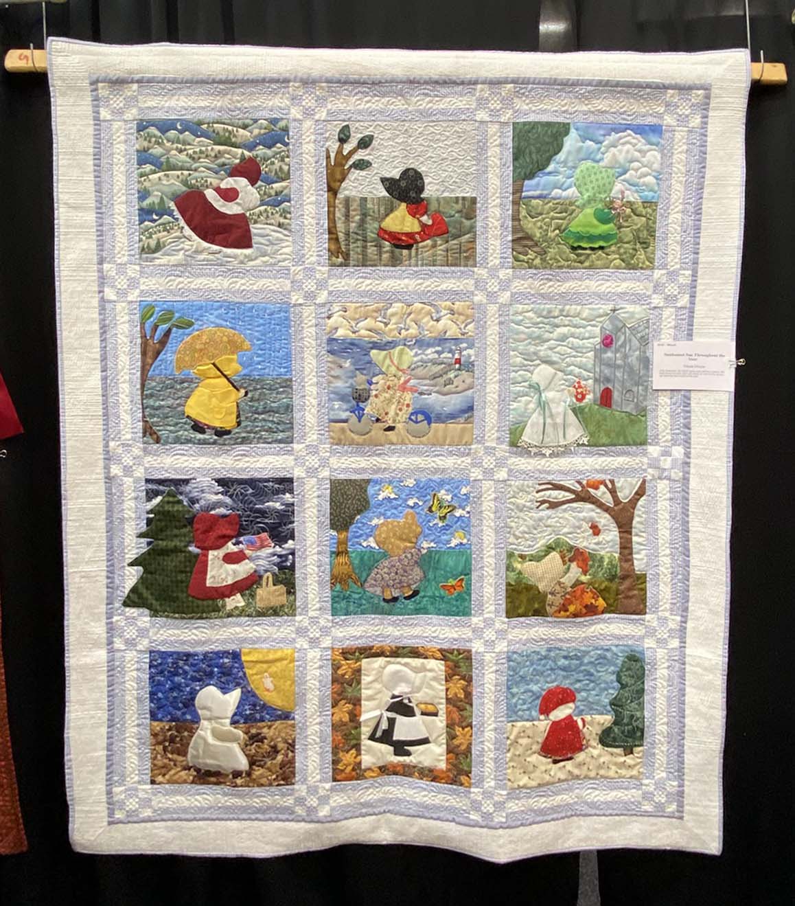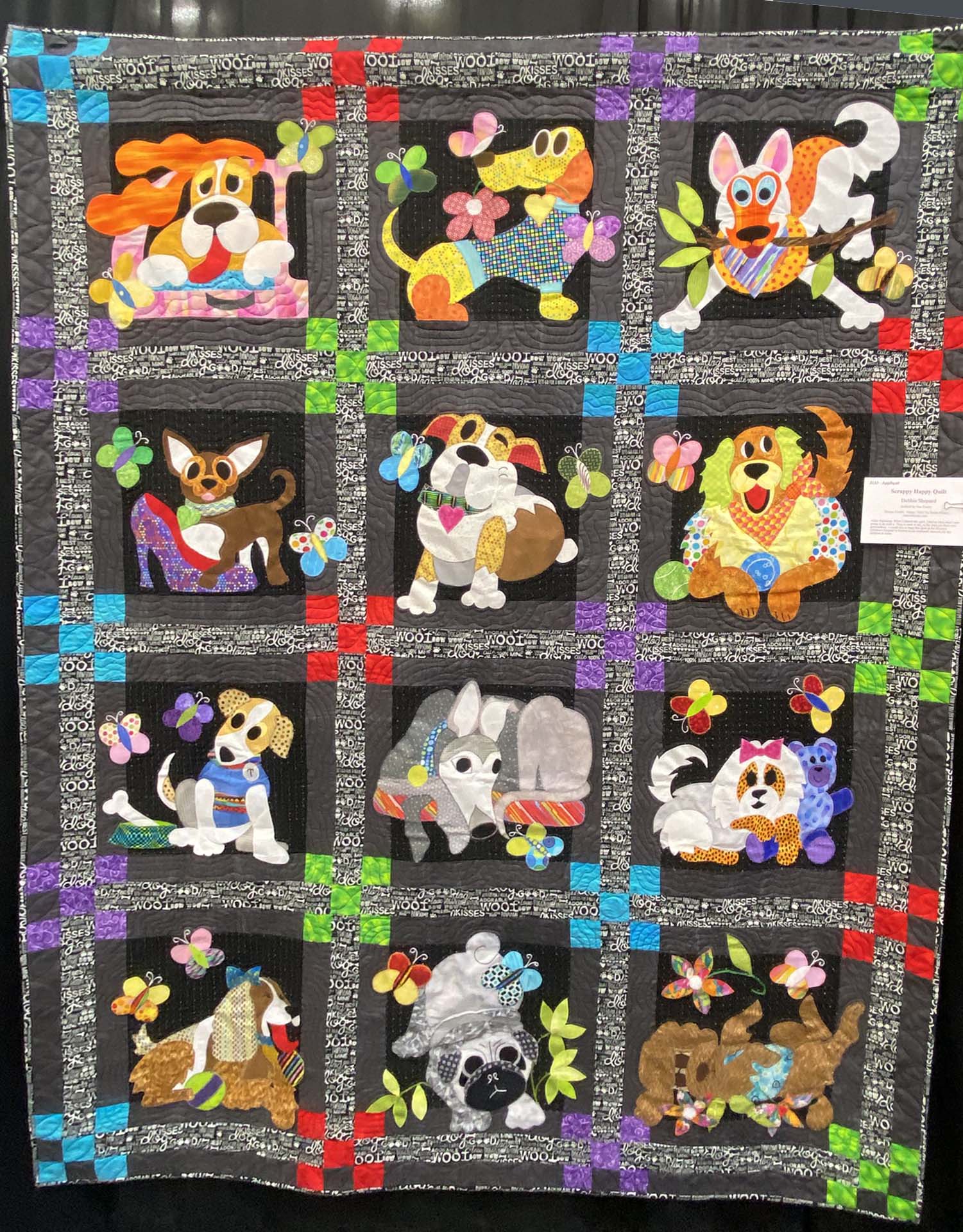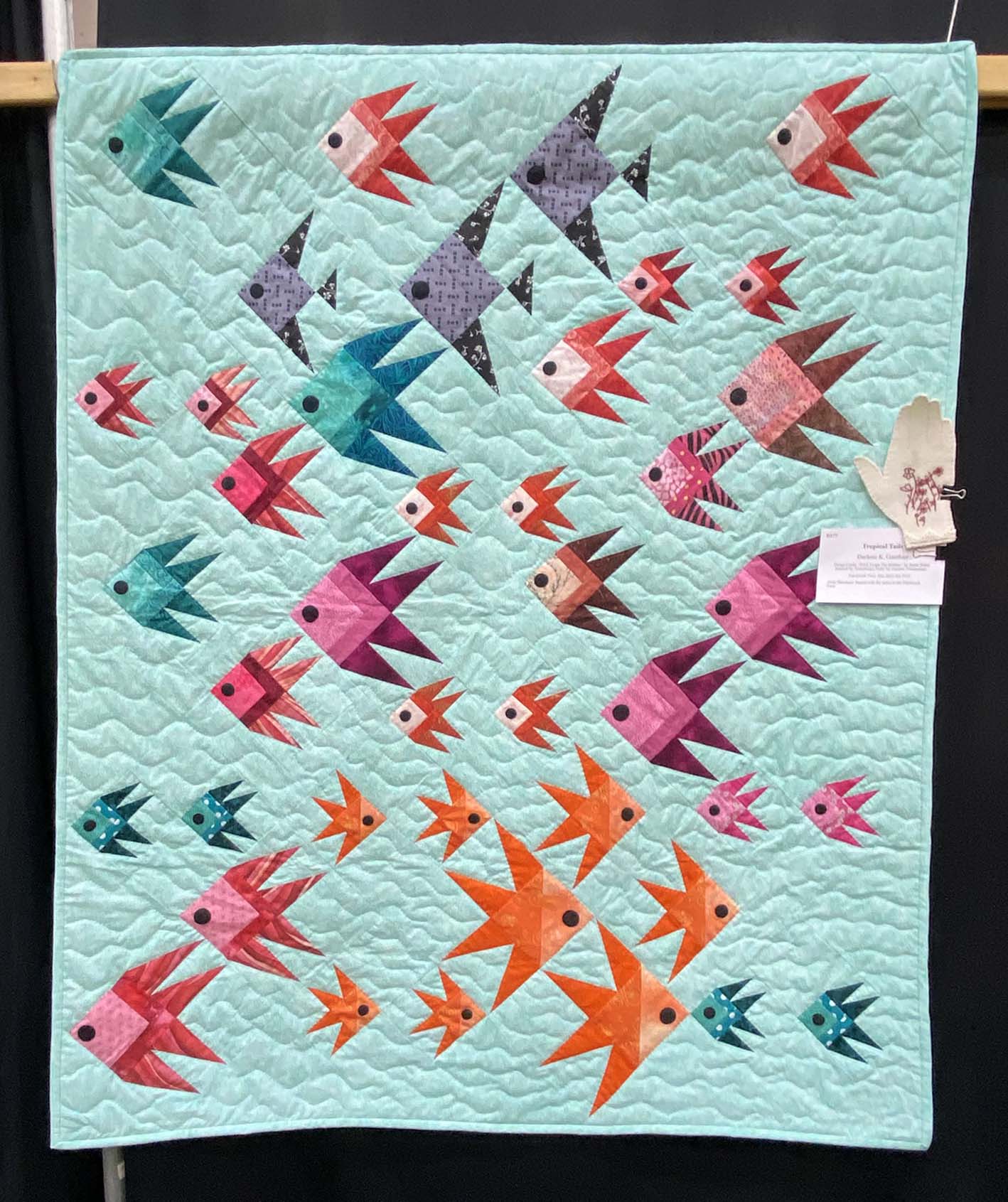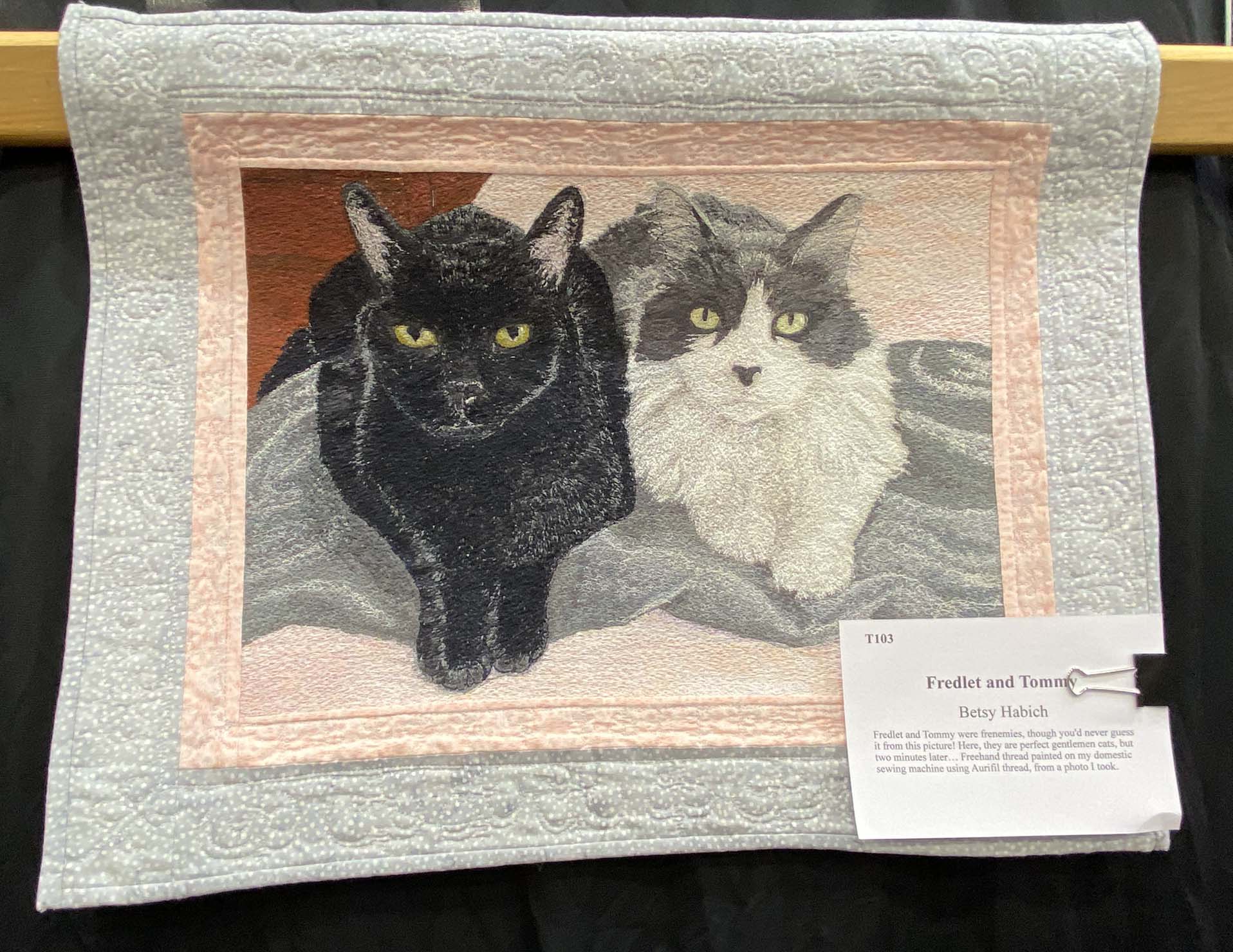 There won’t be a blue ribbon for my show photography and for that I apologize. It was busy, and I had to take the photos at an angle to avoid having people in front of them, then “unskew” the photos in Photoshop. So, usually I can read the name tags on my photos– not so much this time as the unskewing really skewed up the words. I did my best with show book in hand– a few names I just can’t figure out, but I don’t want to delete the quilts. I still may be able to find some on the web–if you recognize one, let me know! Some good news– if you click on the photos, you can see them enlarged.