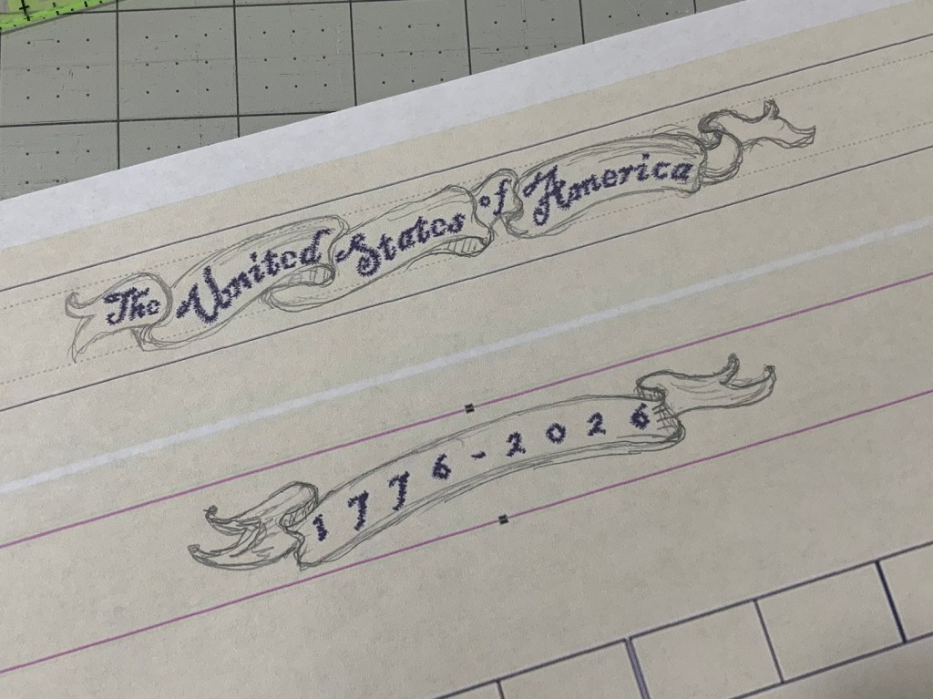 I also made progress on the border design– it has to, well, have something on it! I sketched out these vintage looking ribbons for the top and bottom of the quilt. THEY. ARE. BIG. The typeface is the wonderful “Blackadder” — it’s a bit ragged, but I love the look. This is a 7×11 stitchout.