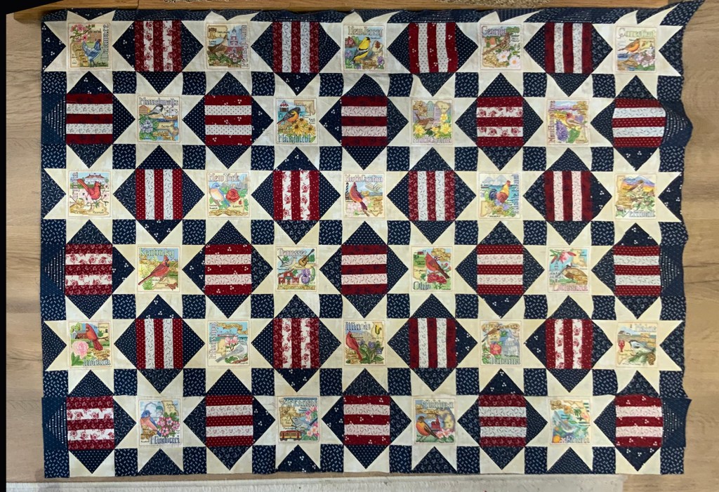 I’ve been able to add one or two rows a day this past week and you can see I’ve reached the limits of my design floor. It’s nice to think I could spend a whole day on it and just finish up, but my shoulders don’t agree. I’m over the halfway mark and starting to assemble the bottom half as a second piece– this thing is heavy! You have no idea how much the weight of the stabilizer in the fifty state blocks adds to the piece. If it comes to nothing else, I will have the perfect “weighted” blanket to soothe away all my anxieties for years to come.