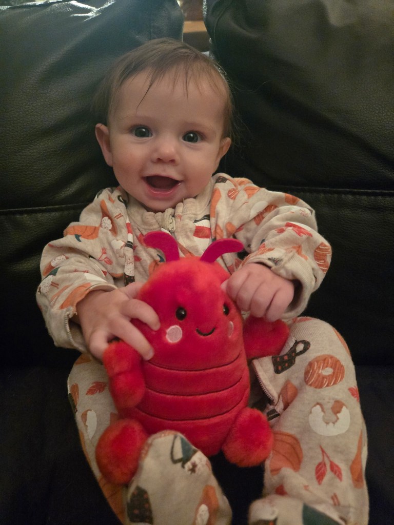 I came bearing gifts– first and foremost, “Clawford” the Lobster who I purchased in Belfast a week or so ag0– it’s never to early to foster this child’s love of MAINE. I think Clawford was a hit.