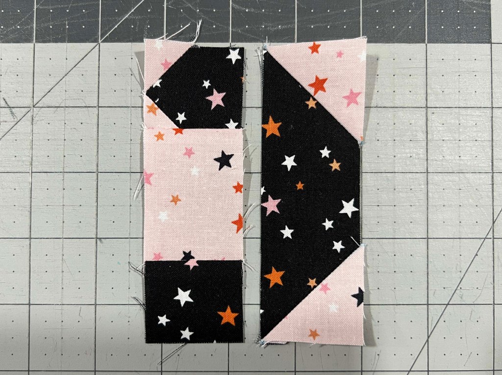 For the left portion of the tail, cut two 1-1/2″ squares in the black, one 1-1/2″ x 2-1/2″ inch background square (I used pink) and two small 3/4″ background pieces to round the tip of the tail– just leave the tip of the tail square if that size piece is too small for you. Stitch and flip the tiny background squares to a 1-1/2″ black square as shown, then sew it to the top of the pink rectangle and add the other black square at the bottom.