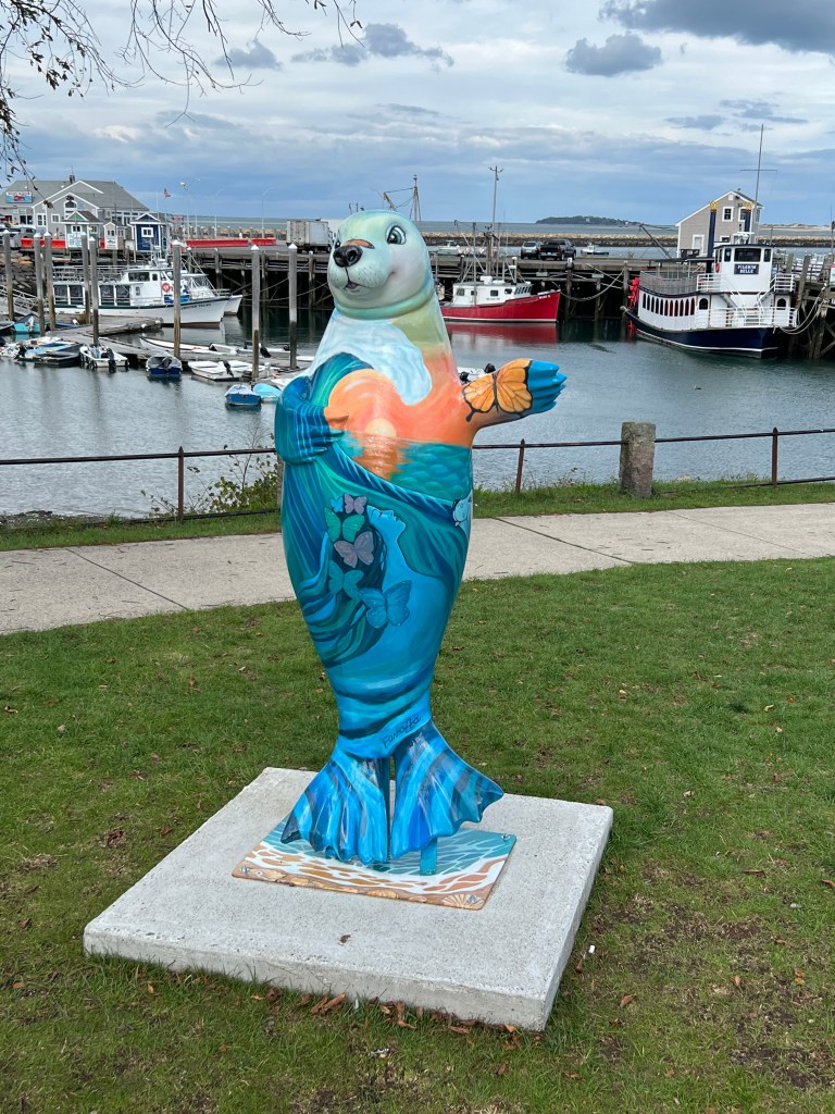 The weather and fall colors were gorgeous down there– I’d never miss a chance to stroll the Plymouth harbor front anytime I drive down. They had these cute painted seals– I’ve also seen shells, ponies, and lobsters done. Has your community ever done anything like this and what was the theme?