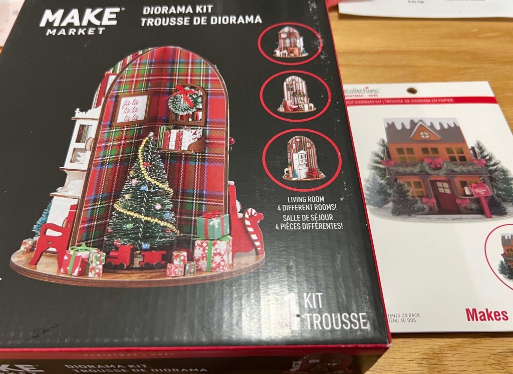 Any trip out to civilization from the boonies of Maine is not complete without a visit to Michaels. If you know me, you know I am up for any type of craft, and I’m happy to report the Christmas options this year are all new and fabulous– much better than the past few years which always seemed a bit of a re-hash. I walked out with this lovely kit and card after much decision making–