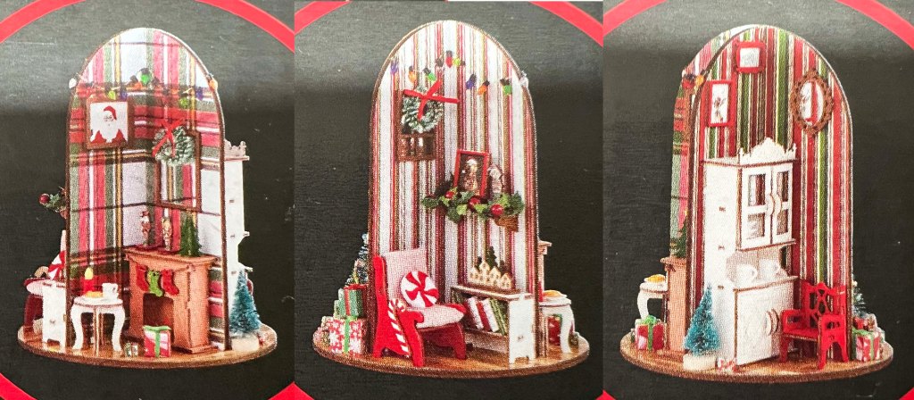 The kit is actually four rooms as you turn it around– I’ve always wanted to design little Christmas rooms for 5×7 embroidery hoops that would join to make a whole house! We have quite a full plate of guests for both Thanksgiving and Christmas, and I intend to put them all to work. I love the wall papers!
