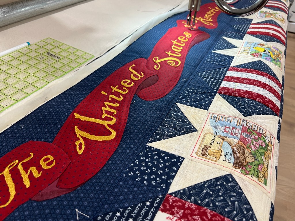 The Carefree Highways Quilt–I was hoping to be able to report back to you on how it went when I tried to embroider quilting in a 5×7 hoop on a 85″ x 100″ quilt 49 times. The good news is, I finished securing all the state embroideries, but I still need to quilt the top ribbon on the longarm before it comes off. It should be done in the next day or so. Then I will be cleaning off my entire desk top to accommodate only my embroidery machine and this quilt. Thank you all, a thousand times, for your encouragement and advice last week and I am extremely hopeful! Don’t miss next week’s post and we’ll see how many I have done…