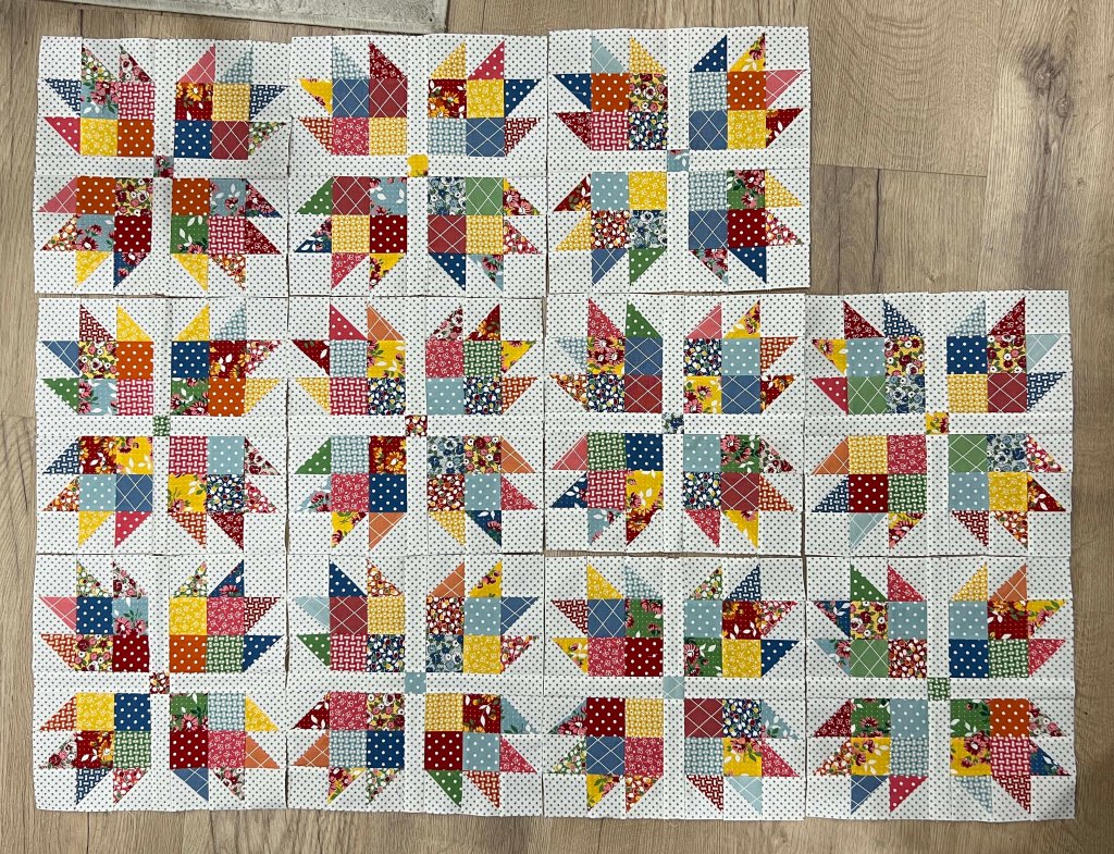 And “Brio”– a Moda tin from years ago– I love this and had planned an elaborate set of eight placemats and a table runner which I then realized wouldn’t even fit on my picnic table. And the idea of a ketchup spill on them wakes me up at night. I’m thinking I’ll make a lap quilt as originally intended– I’d need one more block for a set of twelve and I do have enough fabric for it. This was cast aside in April when baby quilts became a thing– gonna make a decision on what to make and finish ASAP after the holidays. Anything done in January qualifies for my 2025 finish list. My quilts, my rules.