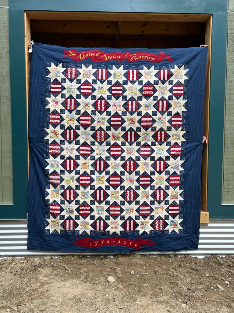 Oops– I skipped this– completed in September… coming soon to an AQS show near me! January is all about fixing my rushed binding, adding a fabulous label and a hanging sleeve. This is 100″ high– I read somewhere that you add the sleeve at 88″ because they can’t accommodate a quilt higher than that. That would be unfortunate because my United States banner will hang over the back. I need to contact AQS to see if this is true and we’ll see what happens.