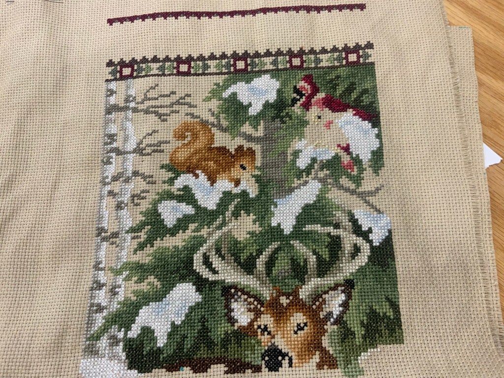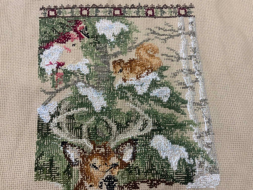 I finished most of the top banner, the deer’s horns, and found some missing fluffs of tree I had to go back and fill in, two or three stitches at a time.