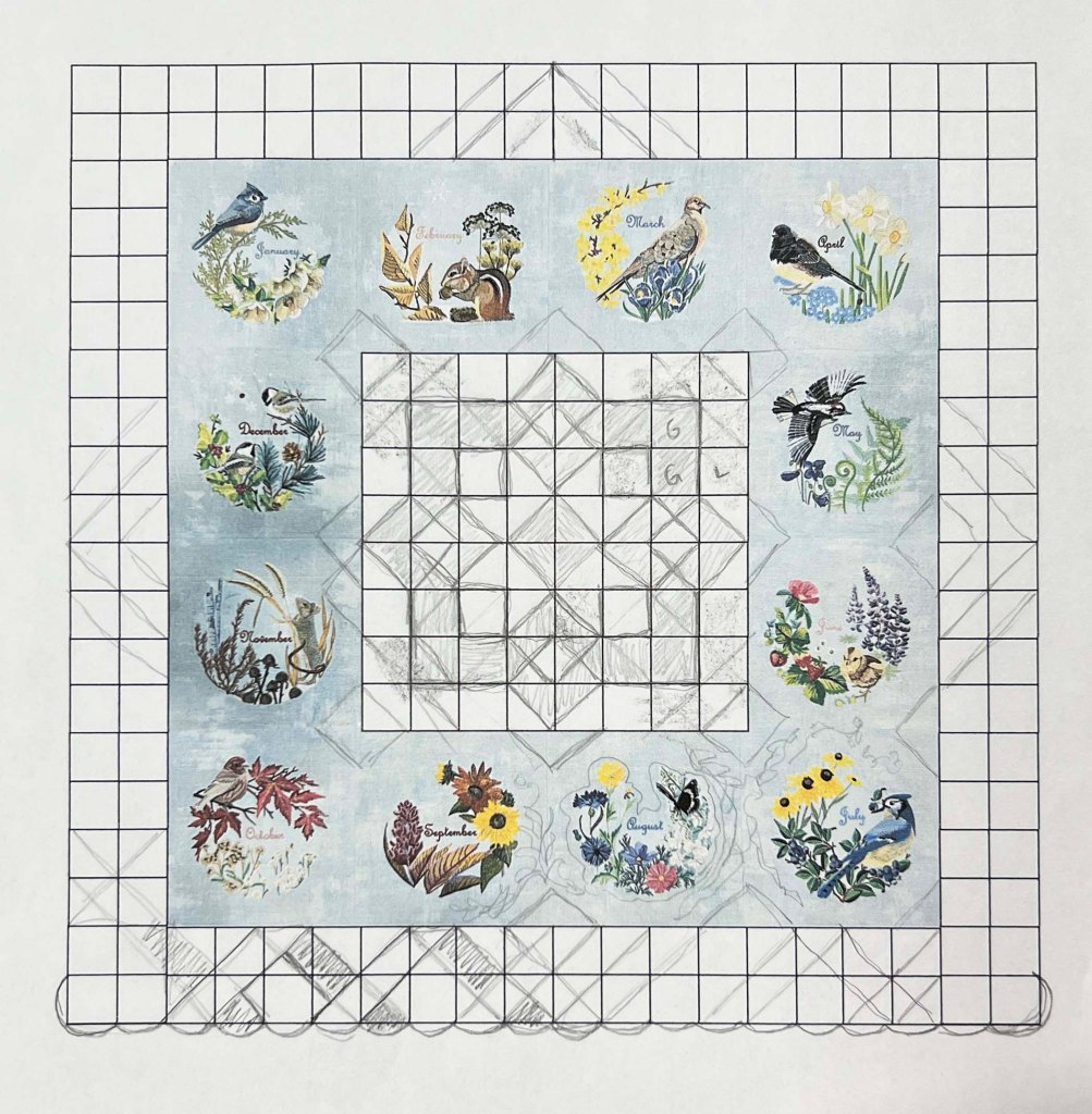 I also took an important step forward in assembling the Year on Sugar Meadow quilt– if you get my emails, you’ve already seen it.