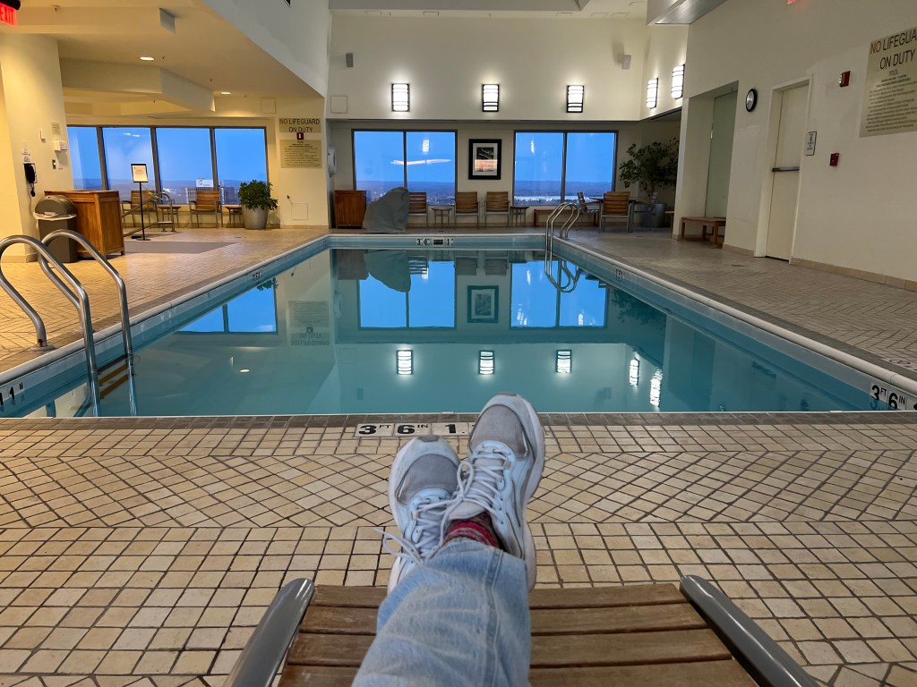That night, I had to check out the pool! It was on the top floor and at sunset, the views were spectacular. One of my old friends met me up there and we sat and stitched and caught up with each other– the perfect ending to a wonderful day.
