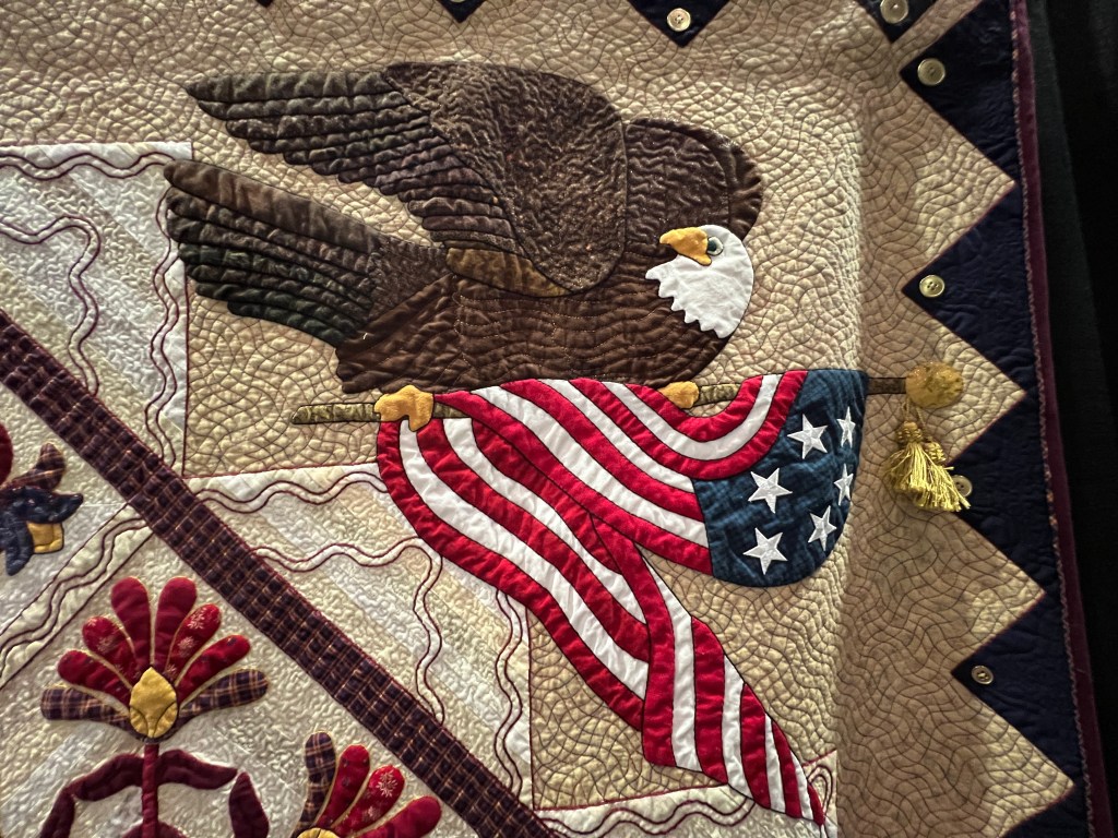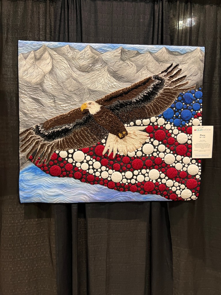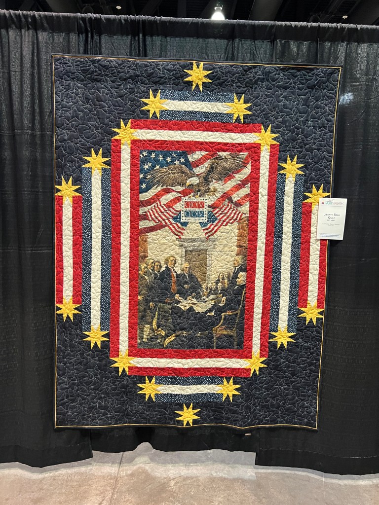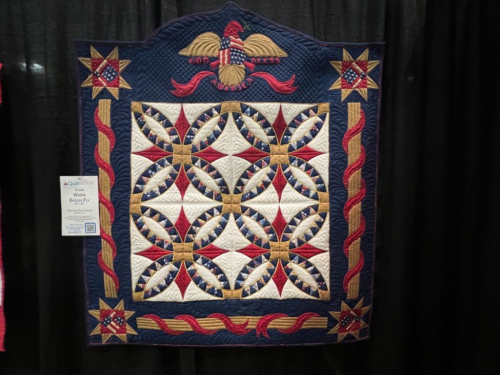 Then, of course, the patriotic exhibits. I’m not exactly sure what the challenges were, and even our tour guide got it wrong! There were a dozen quilts that seem to use the same panel, quilts from the show teachers, and then general quilts; also, American landscapes. One kind of ran on to the next, in a glorious sort of way.