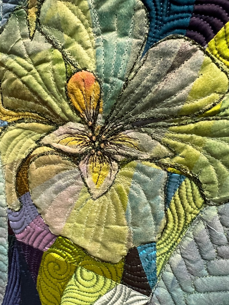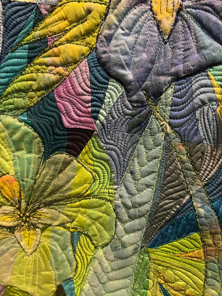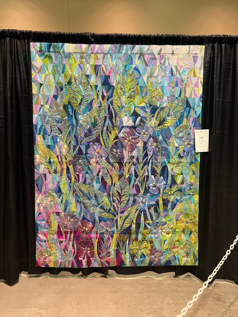 This woman is a genius and a true artist. Just look at all the transitions, the flowers, the background, the thread, the embellishments. It is just stunning. All done in what looks like silk fabric. I’ve actually been a fan of hers for a long time, for her innovative work. I hope this quilt goes on to win a major prize at a future show.