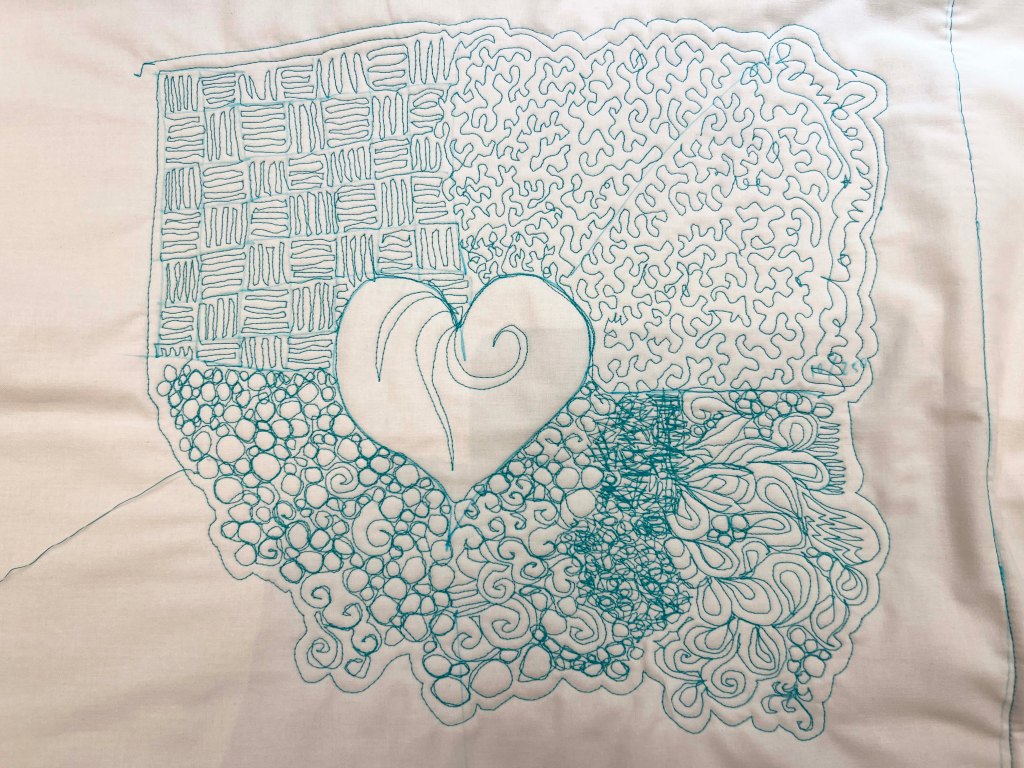My last morning class was on “microquilting”– always something I ‘ve wanted to try. I had to struggle with a sit-down Bernina, not that it wasn’t a beautiful machine, but hand guided and my shoulders aren’t friends. So the theory is, if you heavily quilt background areas, your foreground will pop-up. I also discovered what “manual mode” is for. On my longarm, I only use the stitch “regulated mode”– the machine just does the same number of stitches per inch no matter your speed. In manual mode– it just keeps stitching so you better keep moving! In tiny areas, where you are moving small amounts, you would want a lot of stitches per inch and no one would ever see if you varied from 20 stitches and inch to 50, if you hesitated! So it now makes sense, and I can’t wait to try it at home. Here are my results: