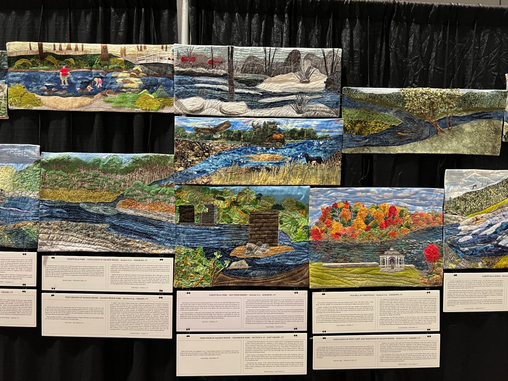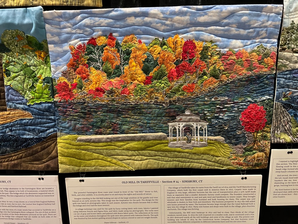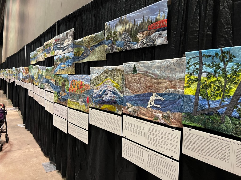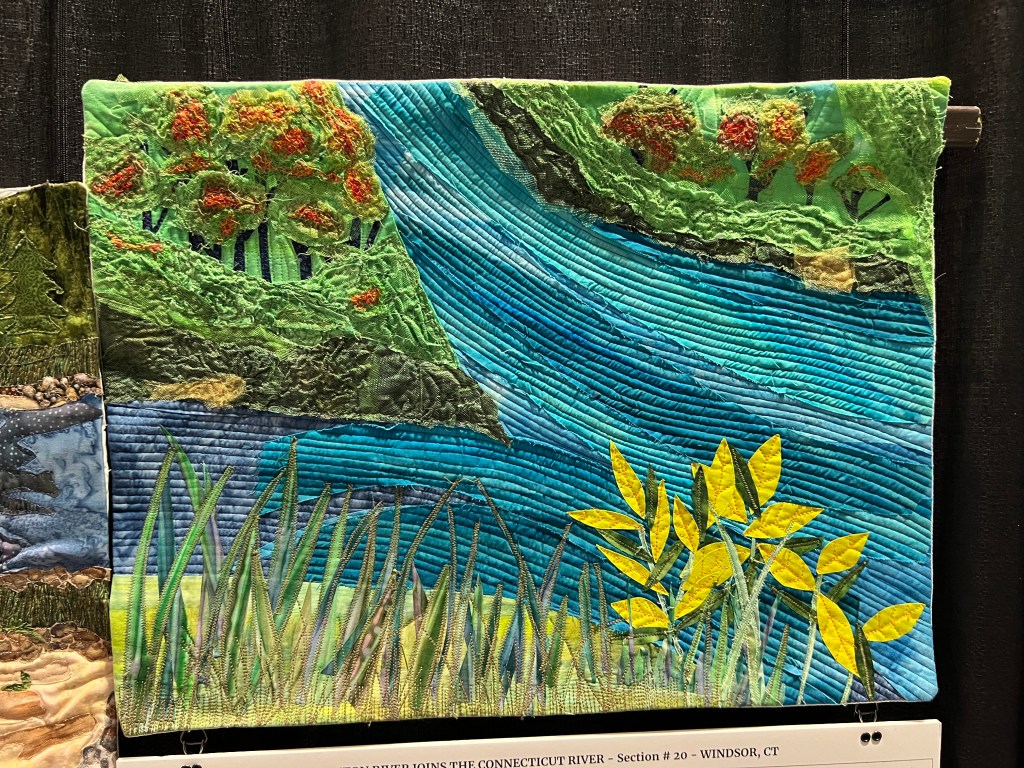 Then we had a “Farmington River” exhibit–these quilts all joined to realistically show this river all along its course, and even showed some tributaries. It was a couple of hundred feet long, at least. This must have been really fun to hang– one of the people in the VIP tour had made one of the panels, and I’m sure she was thrilled to see it in its final place.