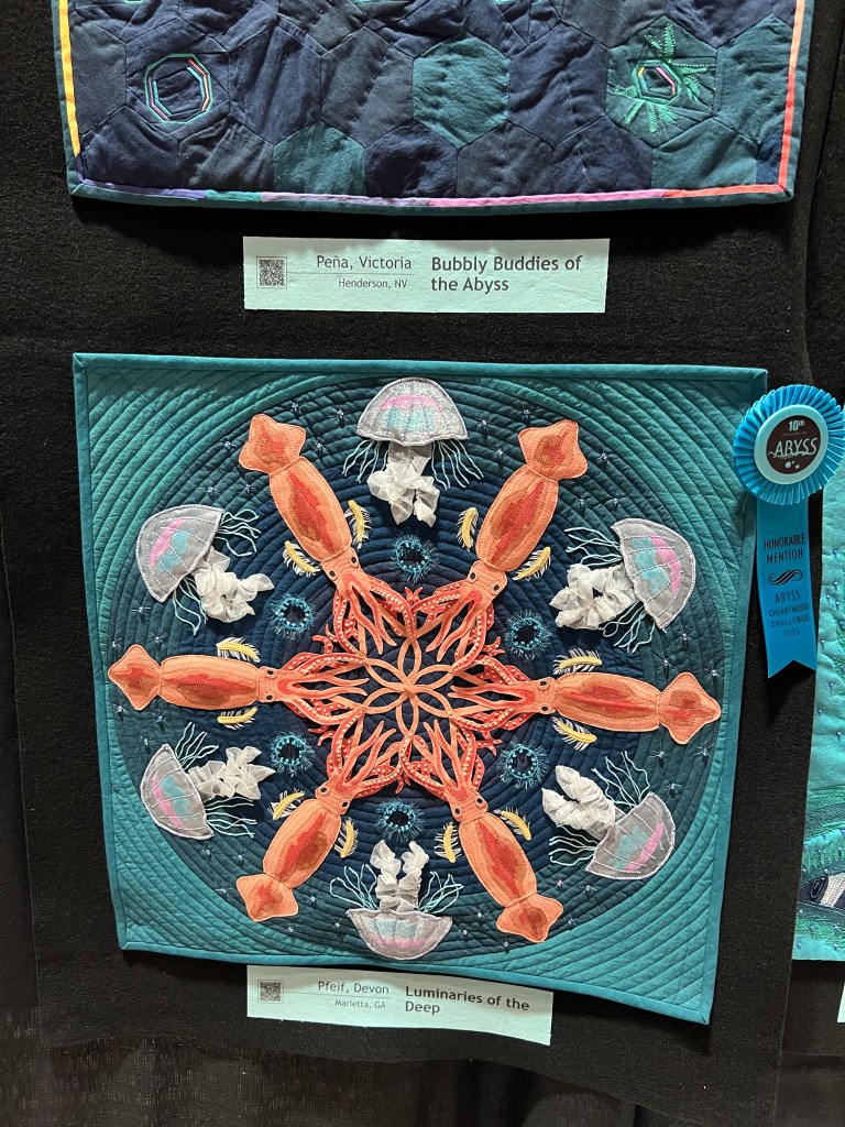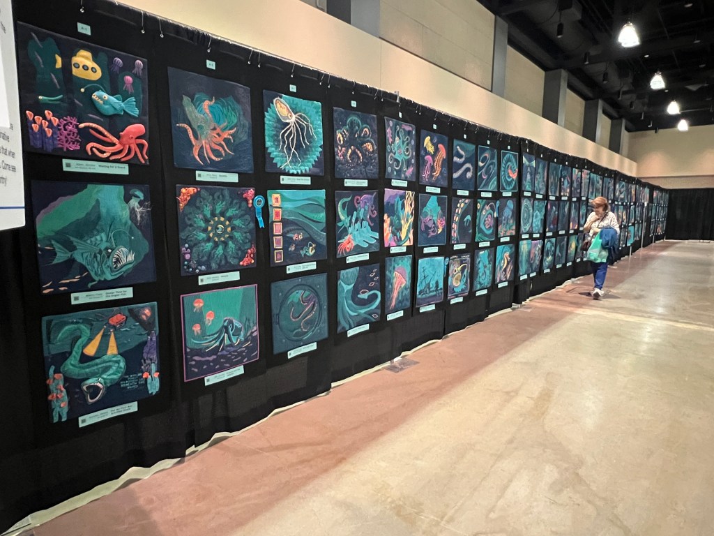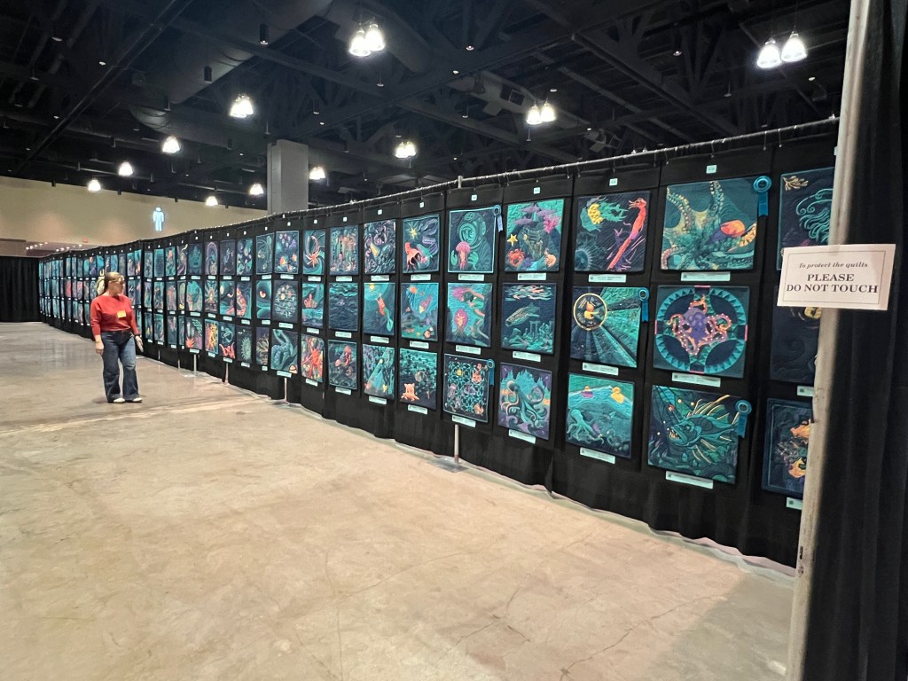 The first one I saw was the Cherrywood Challenge. AQS sponsors this every year, but if you are not familiar with it, each year, a company called Cherrywood offers a bundle of hand dyed fat quarters and throws out a theme– quilters stitch a 20” x 20” quilt. This year’s theme was THE ABYSS. When you see all the quilts hanging together– it is truly impressive! Both sides of this row are filled with octopi, squid, nautilus and more. Now that I can count them on my photos, there must have been about 200 of them.