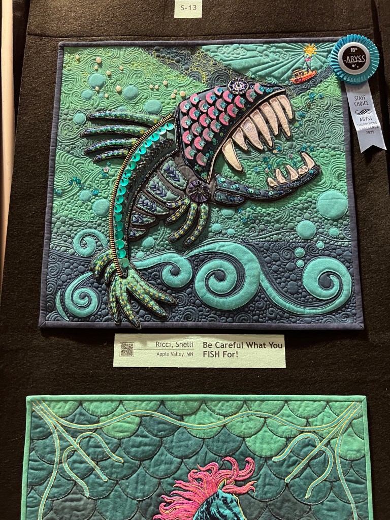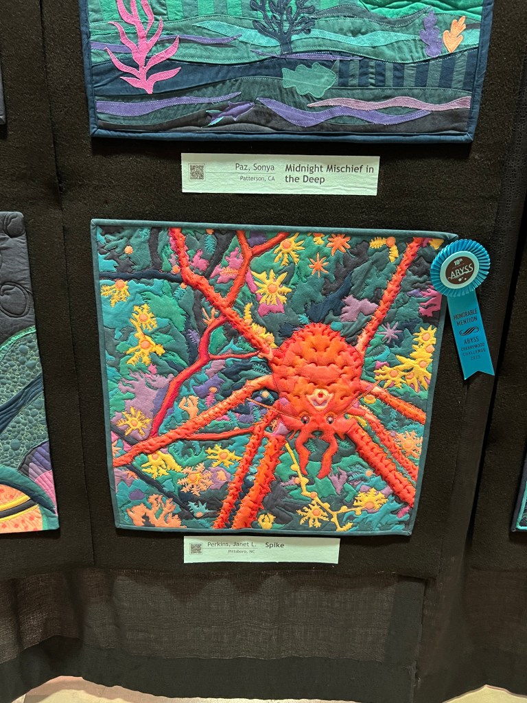I have never been able to figure out if prizes are awarded for these– how could they pick? You can see ribbons for “Honorable Mention” and “Staff Pick,” but I’ve never seen a grand prize winner or second or third place. Maybe Cherrywood holds onto them? Anyway, I LOVE the ocean, and they sorted the quilts by octopi, squid, anglerfish, etc., which was cute and fun.