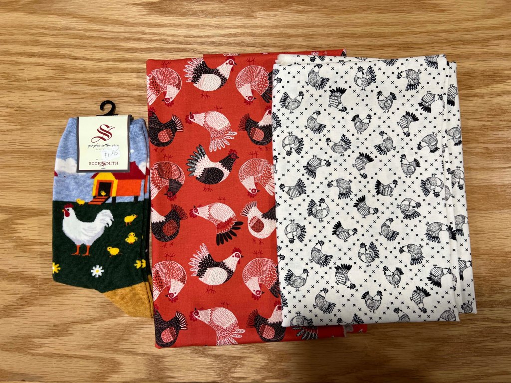 And some chicken socks and fabric! I don’t know how I missed this chicken fabric, but I suspected it was from the new Gingiber “Henhouse” collection– I was right. I didn’t buy the collection when it came out because I didn’t absolutely love all of the prints– with prices up to $150 for a fat quarter bundle, that is my new criteria! But these two prints are impeckable. (See what I did there?) I’m going to look up two-color blocks and see if I can find anything for a kitchen table runner or placemats. Are chicken embroideries inevitable?